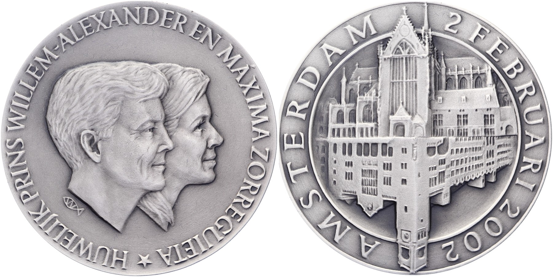2002 Huwelijk prins Willem-Alexander & Máxima Zorreguieta. Dubbelportret van het bruidspaar naar rechts. / Beurs van Berlage + Nieuwe Kerk te Amsterdam. AR 50. Willem Vis. FDC.