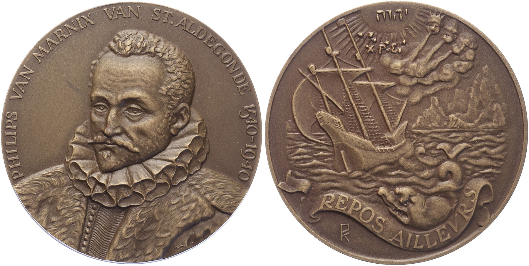 1940 Philips van Marnix van Sint Aldegonde. Gedrongen beeltenis van Philips van Marnix van St. Allegonde. / Schip in branding, door de winden bestookt.Æ 60. KB V-1420; Tilanus pag. 155-157. H.M. Wezelaar. Prachtig.