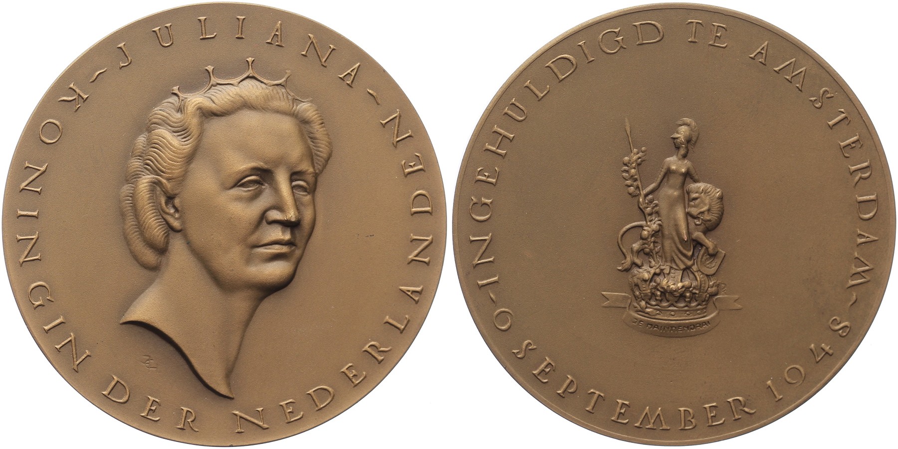1948 Inhuldiging van H.M. Koningin Juliana. Portret van koningin Juliana naar rechts met naamrandschrift. / Staande Nederlandse maagd met Nederlandse leeuw en randschrift. Æ 60. KB V-1794; Tilanus pag. 1991-201. Joop Hekman. Prachtig.