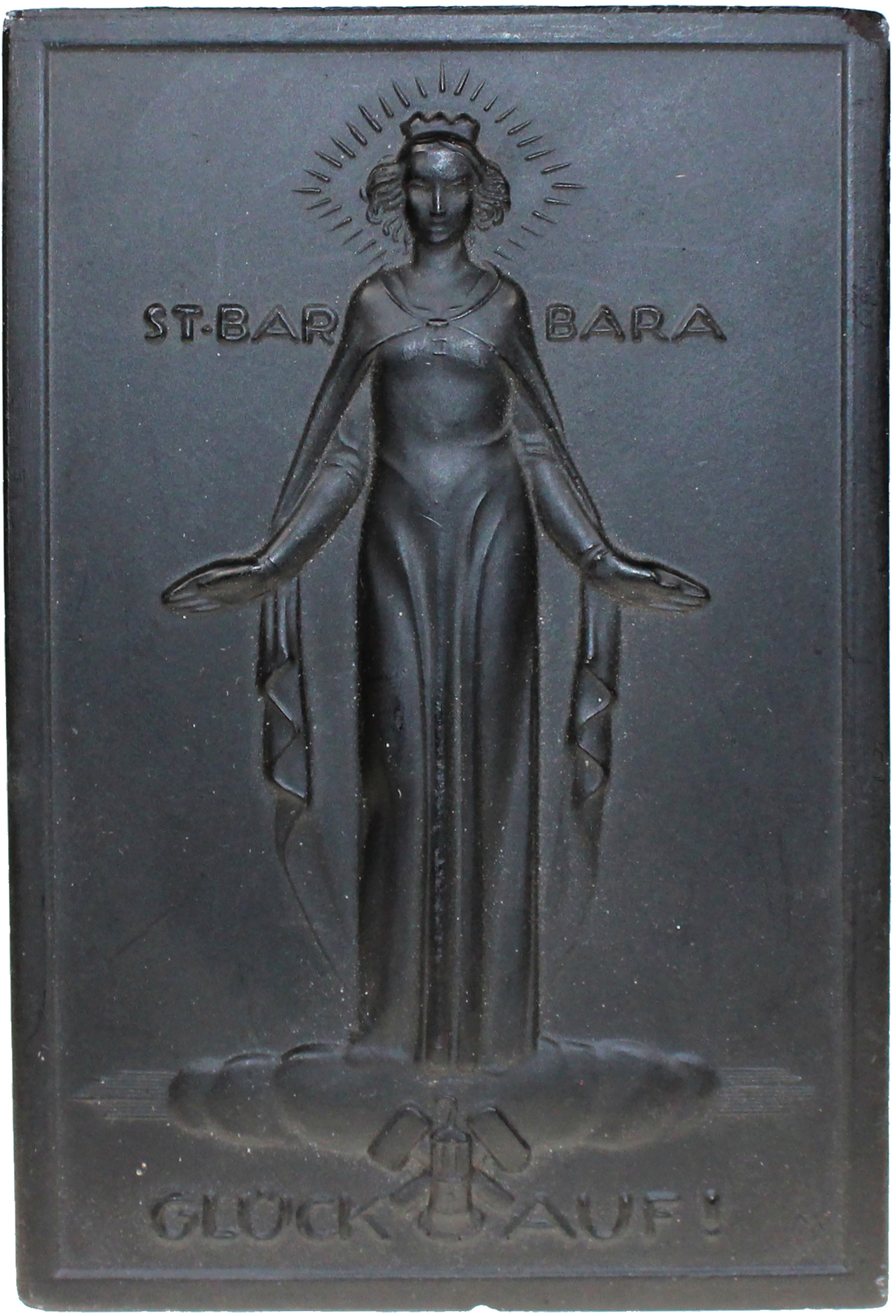 z.j. Schutspatroon Sint Barbara ten voeten uit. Eenzijdig geperst koolstof 88,85x 131,8mm. Rand iets beschadigd. Prachtig.