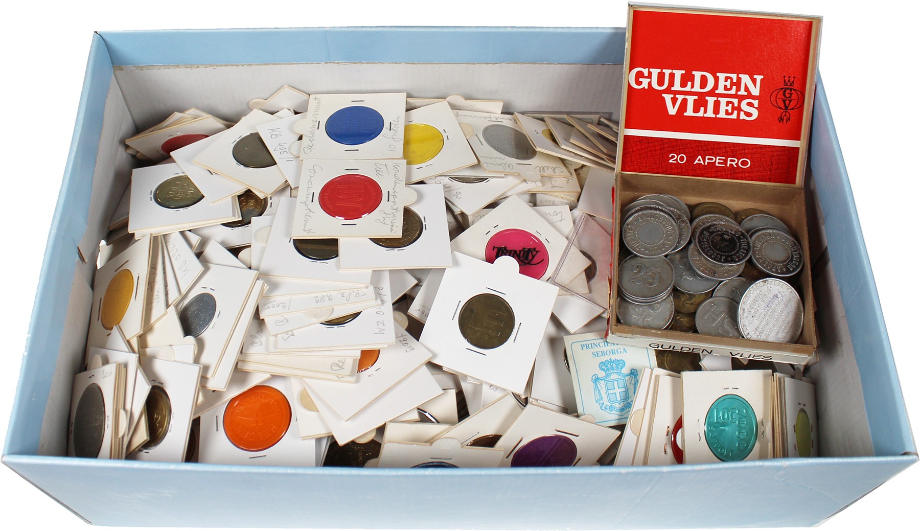 Schoenendoos met groot aantal tokens en consumptiepenningen onuitgezocht.