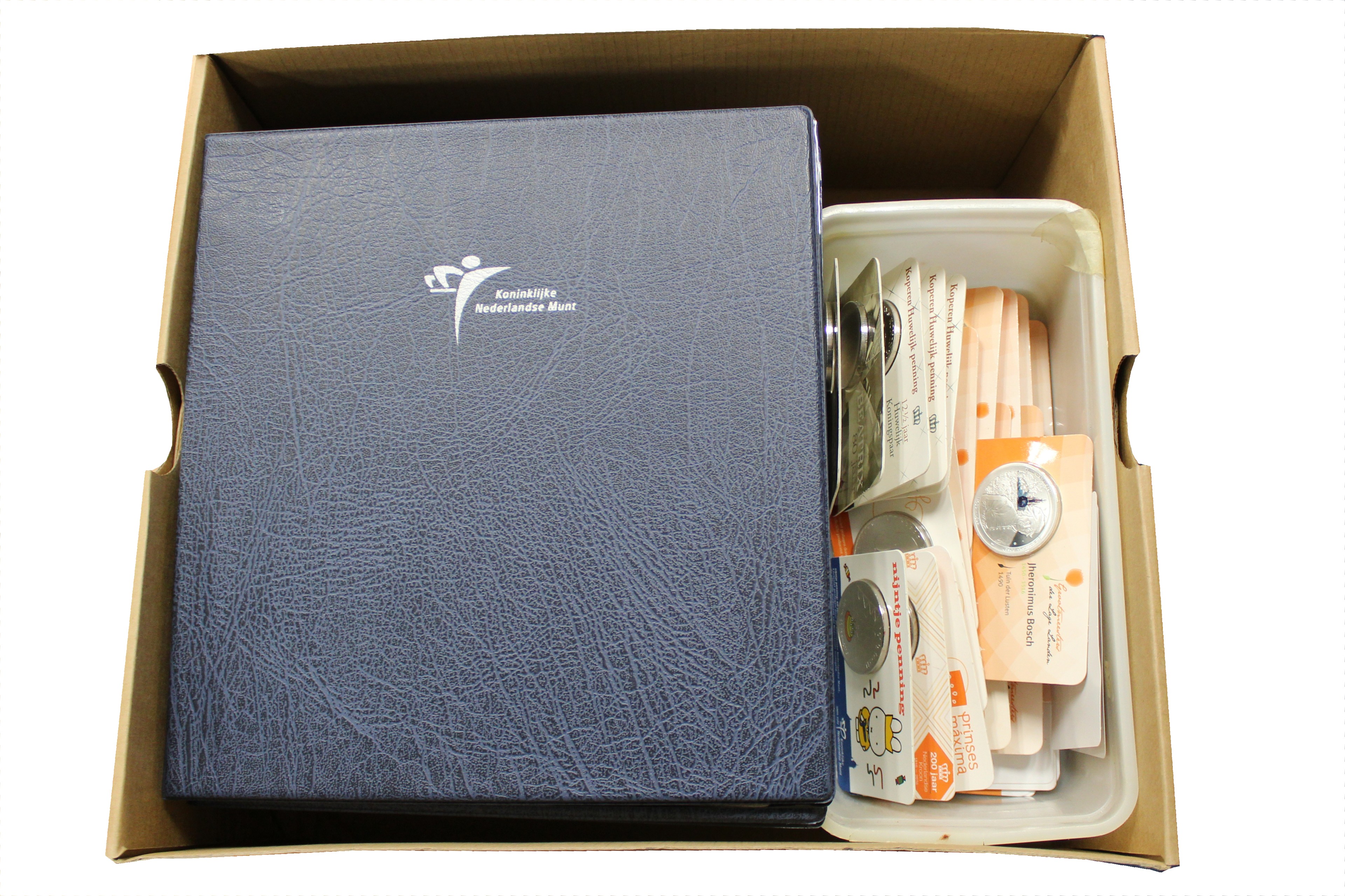Dr. Martens schoenendoos met album met penningen, coincards penningen van KNM. Toegevoegd: 4 mapjes met zilveren postzegels.