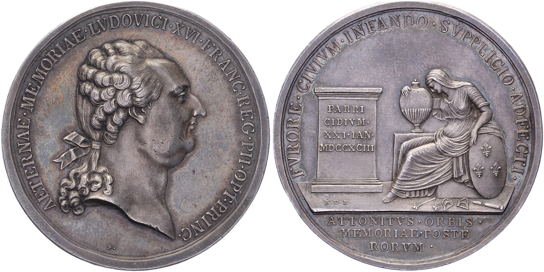 1793 Death of Louis XVI. Head of Louis XVI to right; in exergue signature B. / La France seated, leaning on an urn. On the ground the crown and sceptre broken. In front an altar. AR 47 [26,05 gram]. Hennin 467; Julius 258. P. Baldenbach. EF. - Purchased from Munthandel Verschoor, Oktober 2005.