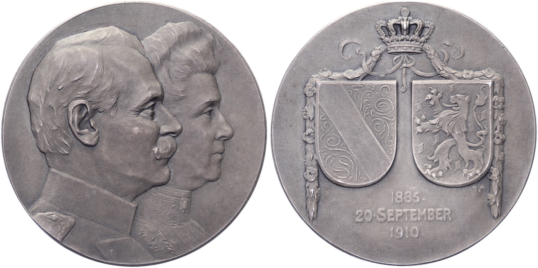 1910 Silberne Hochzeit Frederick II von Baden und Hilda von Nassau. Doppelporträt nach rechts. / Gekrönte Wappen. AR 38 [23,11 gram]. Zeitz 758. R. Mayer. Sehr schön / vorzüglich. - Purchased from Jean Elsen, December 1997, auction 52, lot 835.