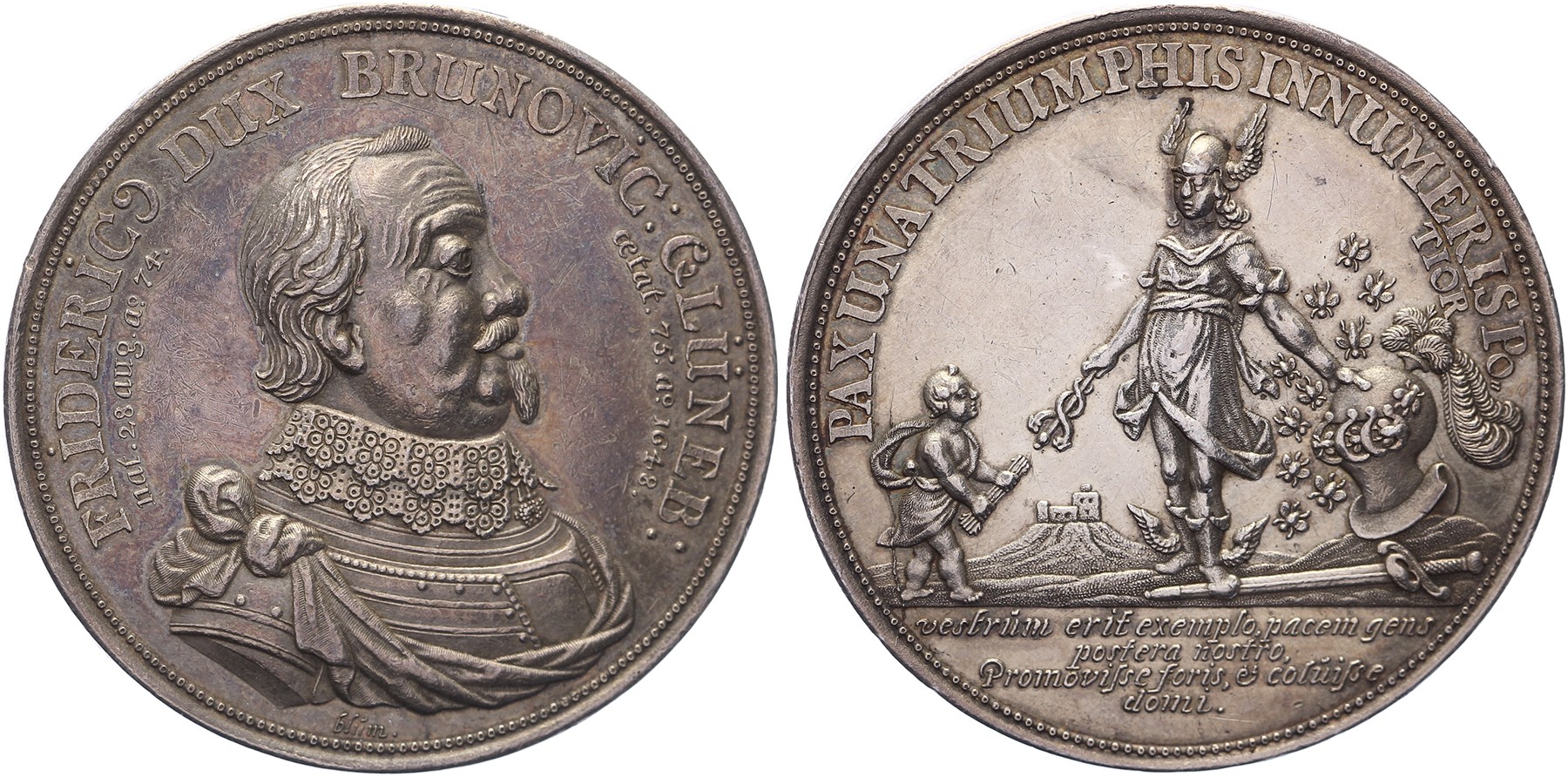 1648. Frieden von Münster / Westfalen, Friedrich von Braunschweig-Lüneberg zu Celle. Brustbild nach rechts. / Stehende Merkur. AR 44 [32,36 gram]. Fia. 463; Pax 1146; Knyph 2059. J. Blum. Krätzer im Feld. Selten. (R). Vorzüglich. - Purchased from Laurens Schulman BV, November 2001, auction 26, lot 1921.