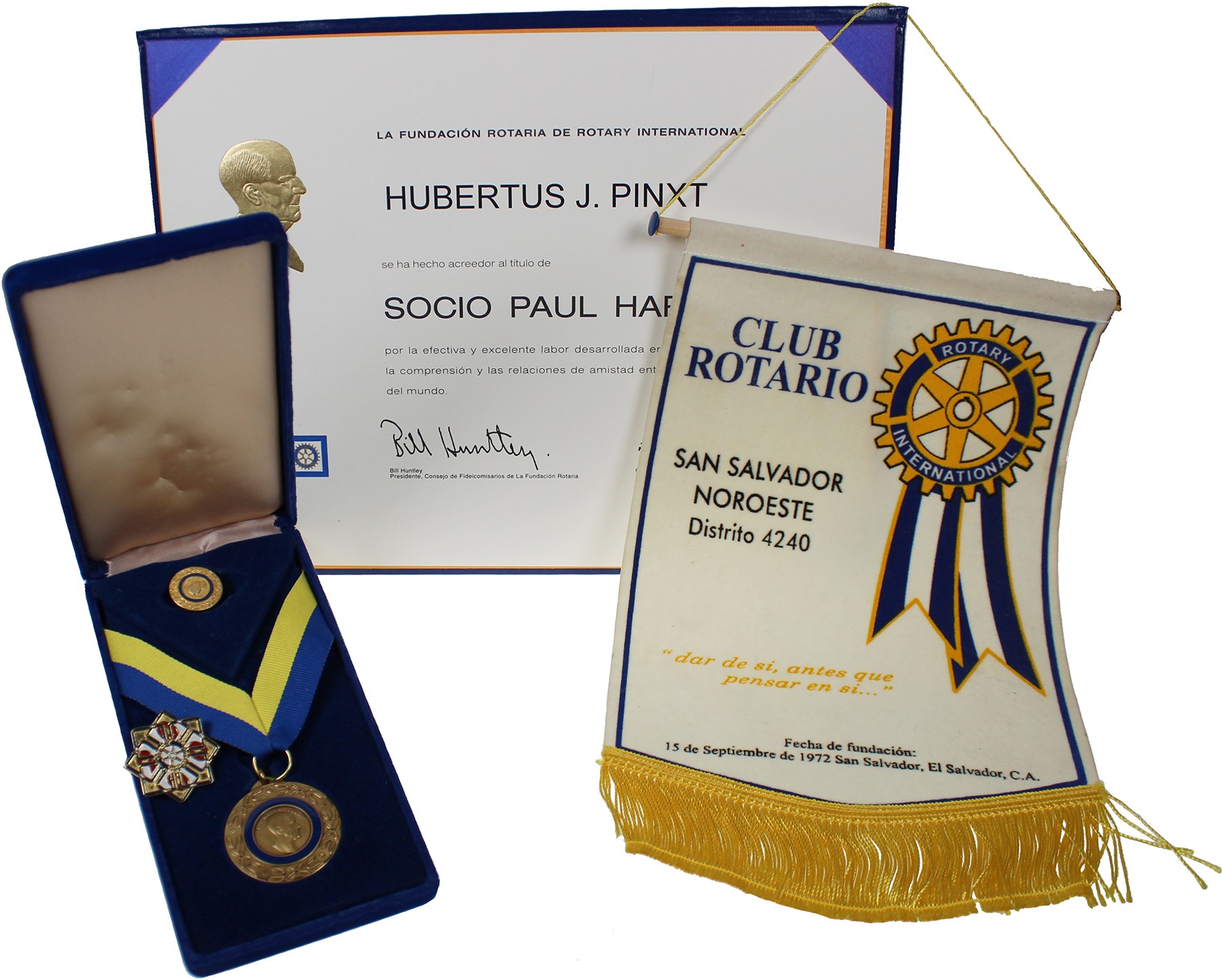 Medaille van de Internationale Rotary Club in originele cassette. Toegevoegd: origineel diploma + vaantje afdeling San Salvador Noroeste Distrito 4240. FDC.