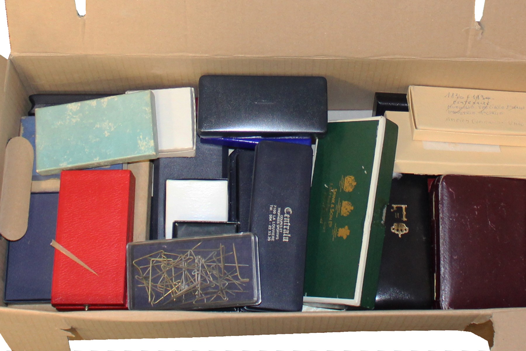 Doos met circa 70 cassettes en doosjes, voornamelijk voor onderscheidingen. Diverse landen.