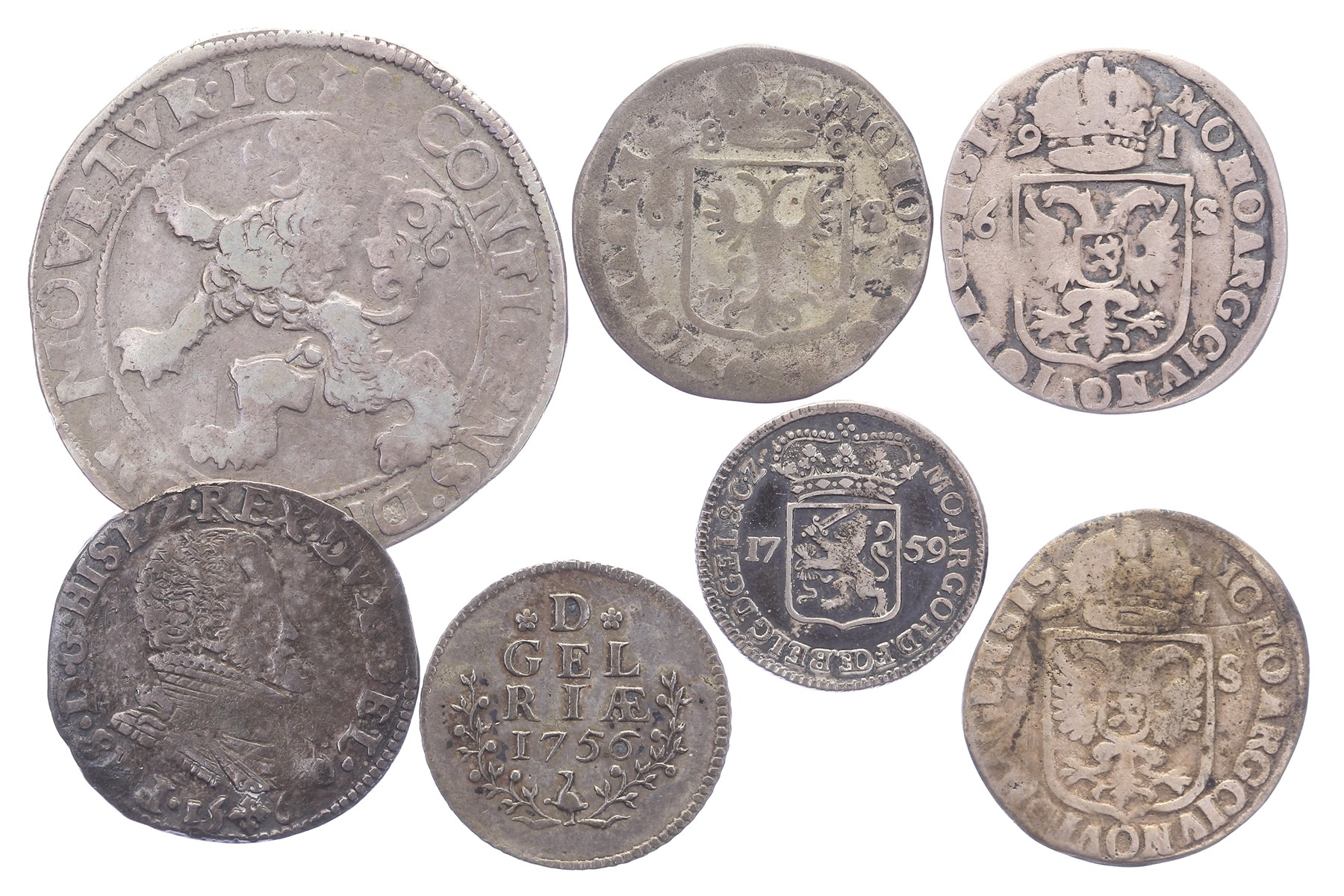 Lot (7) o.a. Leeuwendaalder 163?, 1/5 Philipsdaalder, 3 x Ruiterschelling Nijmegen, ¼ Gulden 1759, zilveren duit 1756. Fraai en beter.