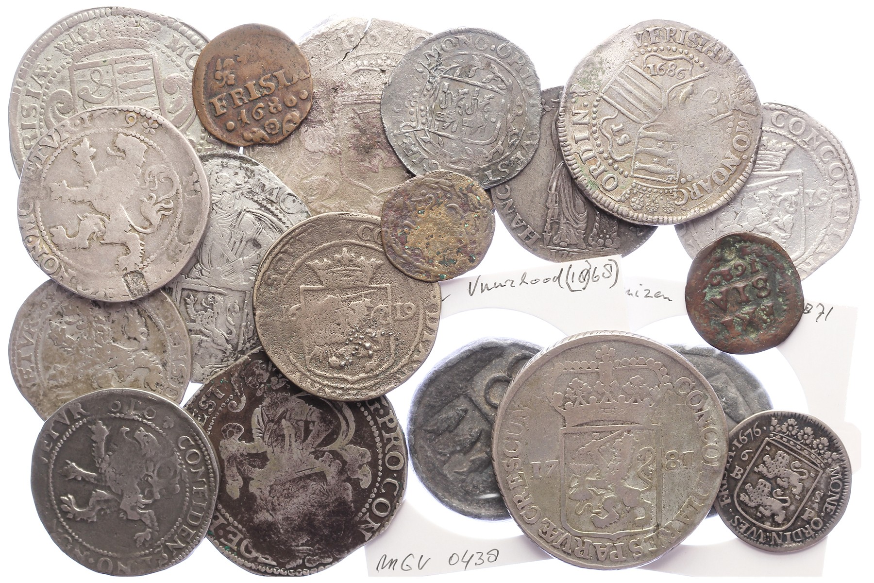 Kistje (ca. 15 stuks) uitsluitend zilver, o.a. Leeuwendaalder, rijders, dukaat etc. Matige kwaliteit!