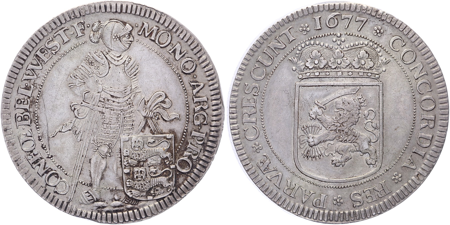Zilveren dukaat 1677. Delm. 972; CNM 2.15.2; HPM 78. Lichte krasjes vz. Zeldzaam. Vrijwel prachtig.