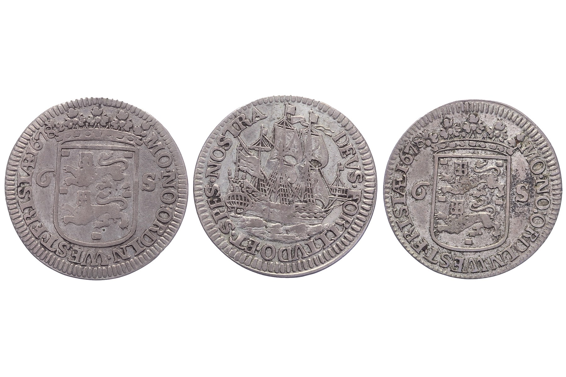 Lot (3) Scheepjesschelling 1678. CNM 2.15.8; HPM 81. Gemiddeld zeer fraai.