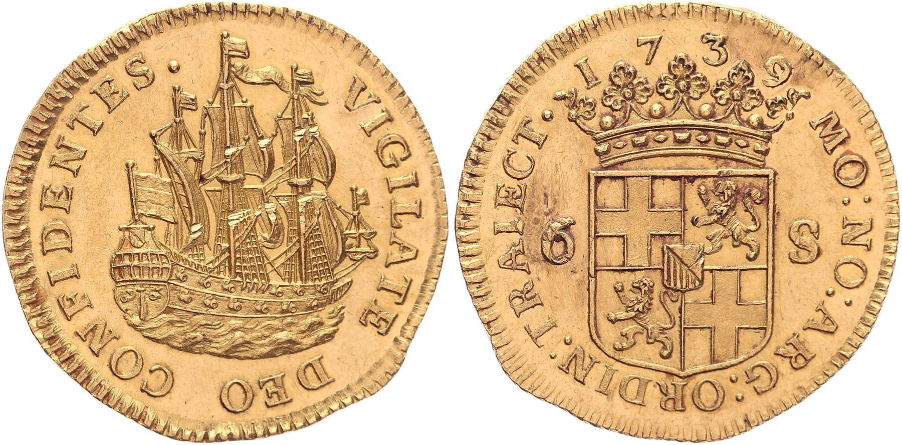 Scheepjesschelling 1739, met kabelrand. Afslag in goud van 6,94 gram. Delm. 986; CNM 2.43.136; HPM 83.1. Enkele krasjes. Prooflike. RRR. Prachtig.