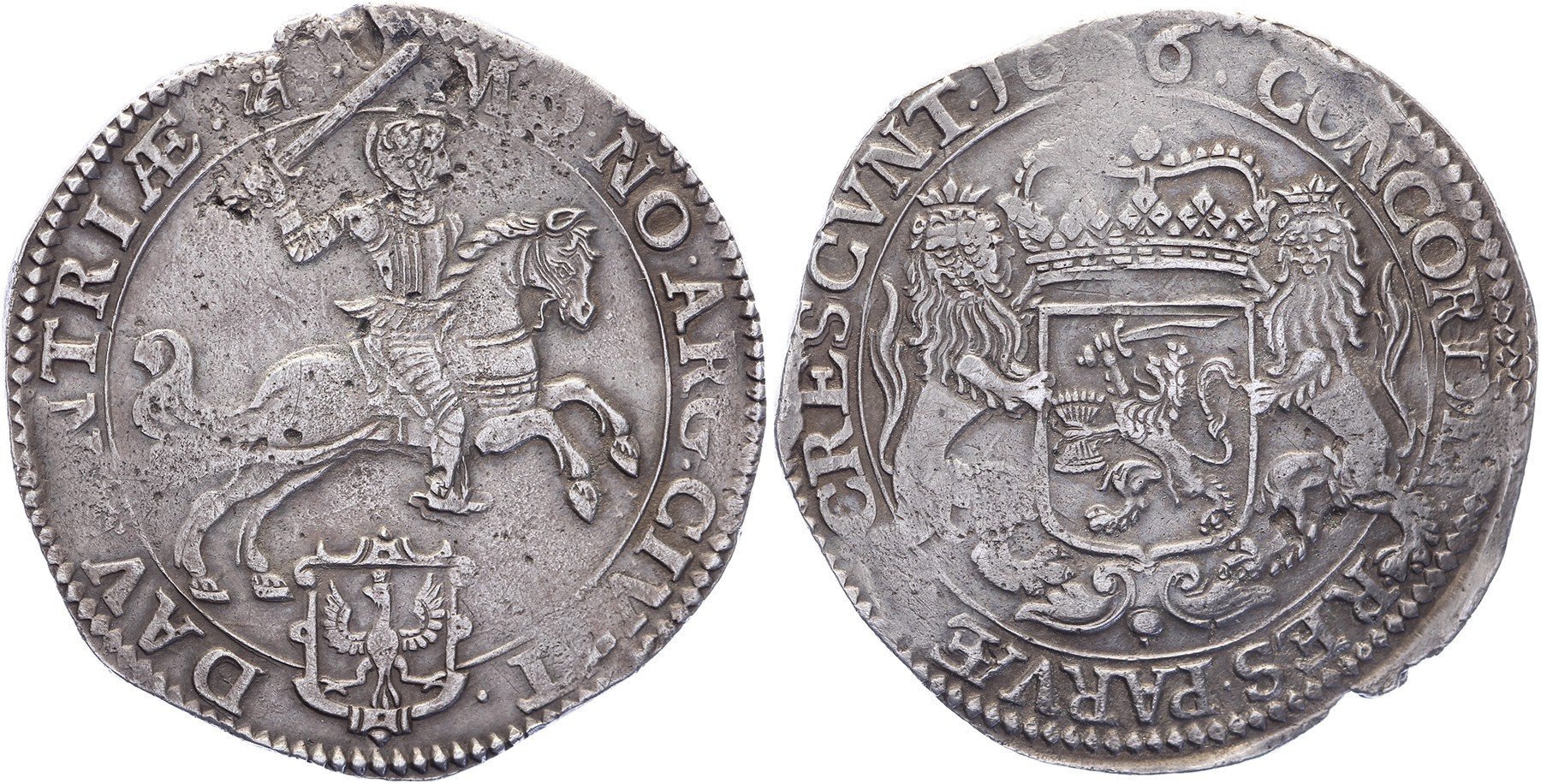 Rijder of dukaton 1666, mmt. zittend hondje. Delm. 1038; CNM 2.12.27; HPM 21. Rand iets uitgebroken, enkele gietgallen. Fraai / Zeer fraai.