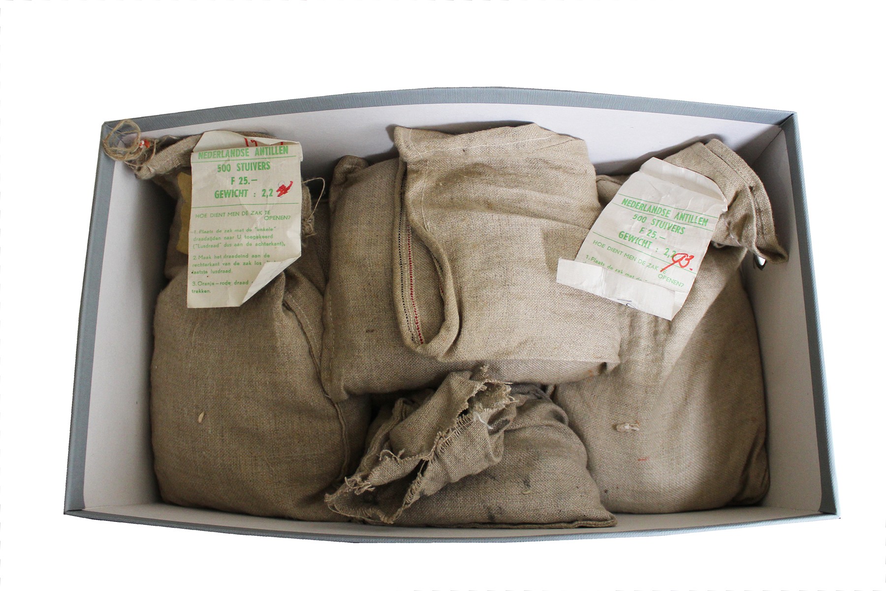 Doos met originele juten zakken van ’s-Rijks Munt met Nederlandse Antillen, o.a. 500 x 1 gulden 1980, 2 x 500 stuivers, meer dan 500 x 1 cent 1961!! En 2½ cents 1979. Allen UNC.