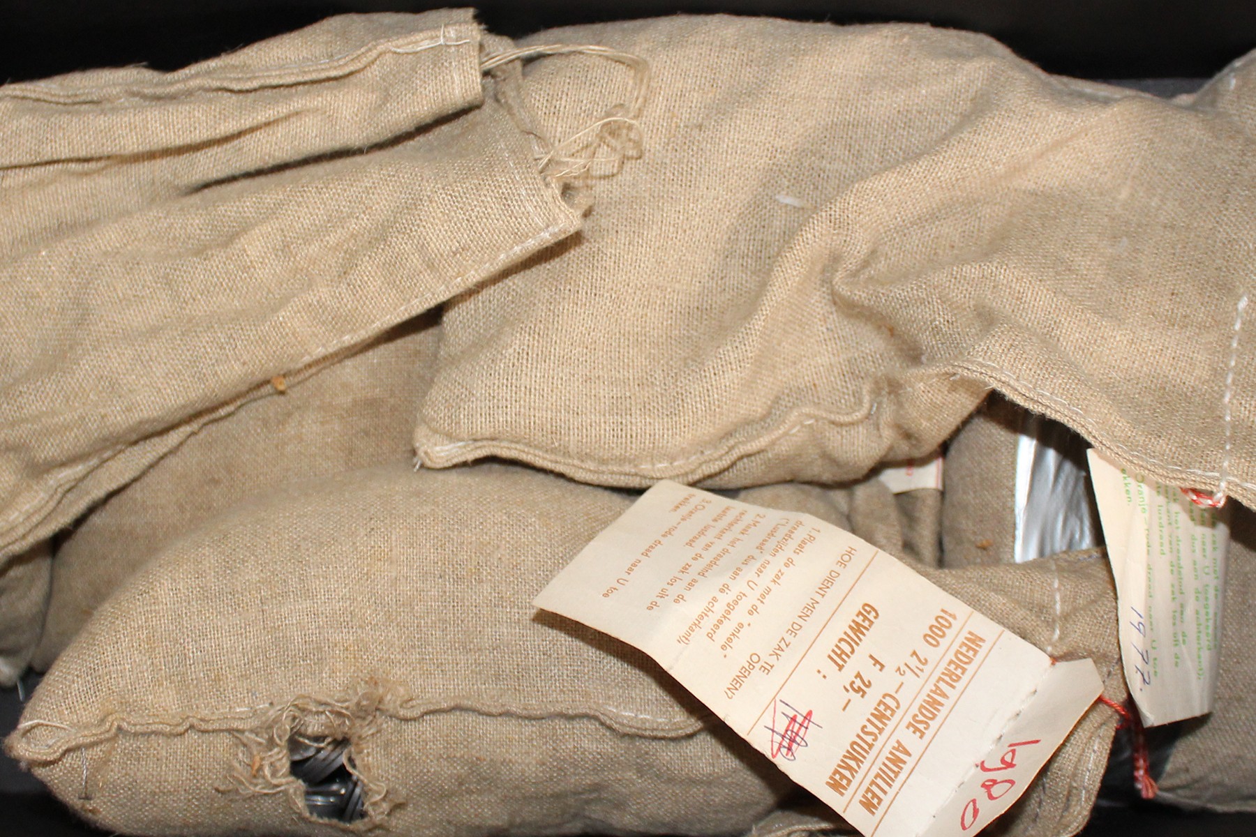 Doos met originele juten zakken van ’s-Rijks Munt met Nederlandse Antillen, o.a. 500 x gulden in dichte zak, 500 x 5 cents, ± 1000 x 2½ cents, 5 cents 1979 en 1980. Allen UNC.