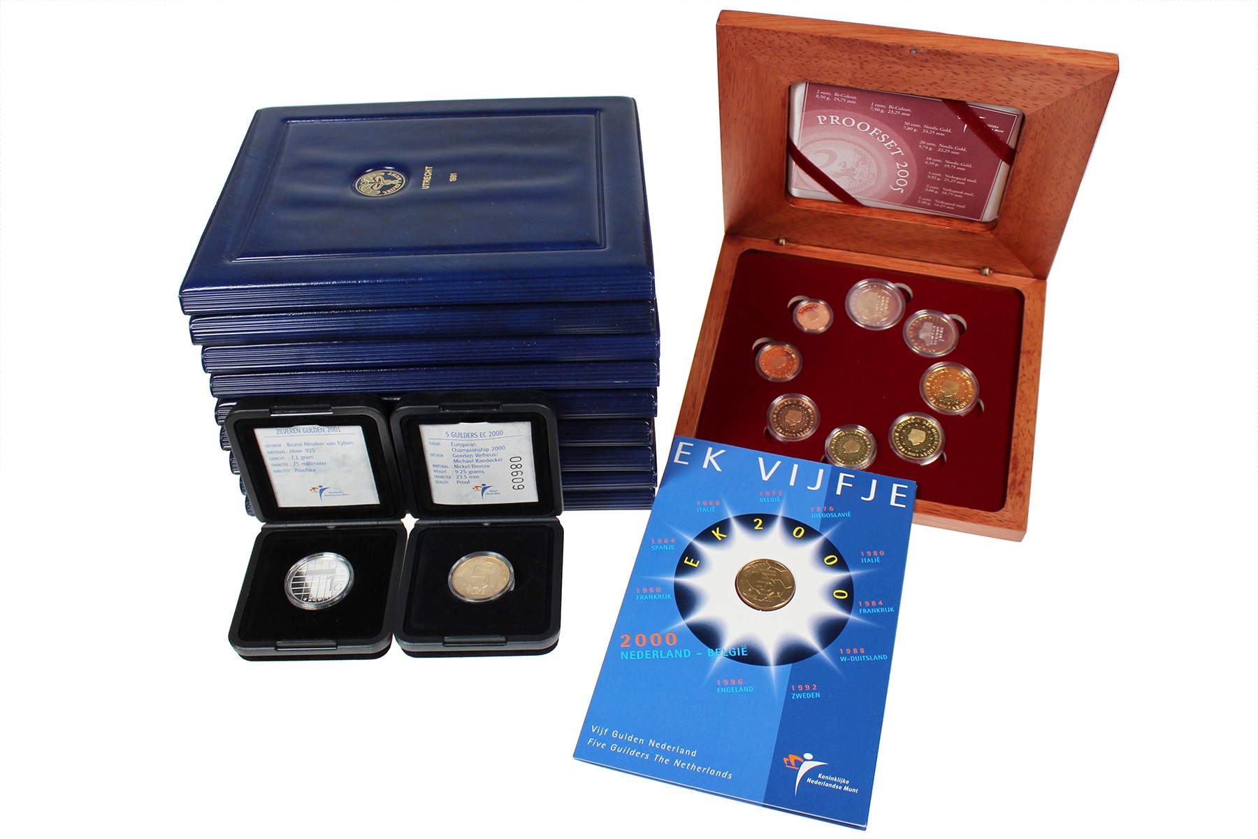 Doos met o.a. 9 proofsets Nederland 1985 -1992, 1993 en 2005. 2 x 5 gulden EK en zilveren gulden 2001.