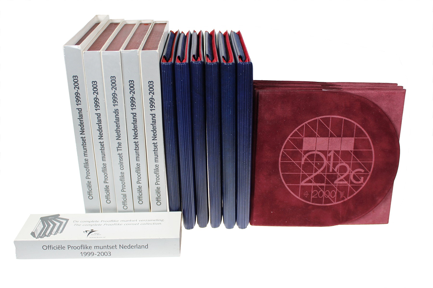 Doos met proofsets Nederland, 9 stuks! 1984, 1988, 1989, 1990, 1992, 1994, 2000 en 2001 (2). Prooflike sets 1999-2003.