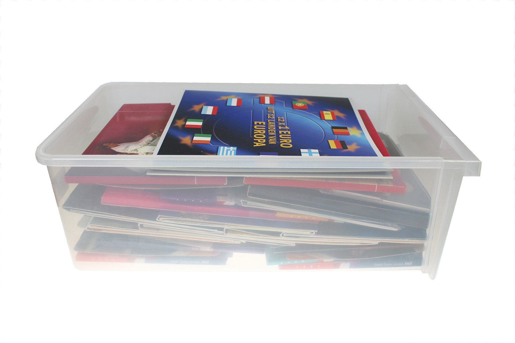 Kunststof opbergbox met ca. 40 stuks eurosets allerlei. O.a. goede doelensets en huwelijk.