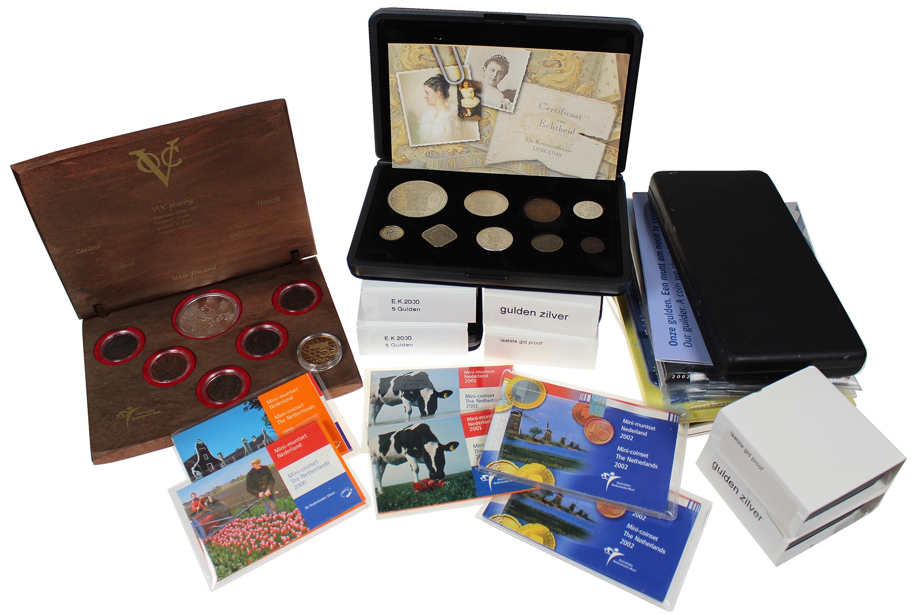 Doosje met o.a. Benelux-set, zilveren gulden 2001 (2), laatste gulden 2001 (2), 5 gulden EK 2000 (2), diverse minisets (6), Rabo-set, ERU-set, babyset etc, etc.