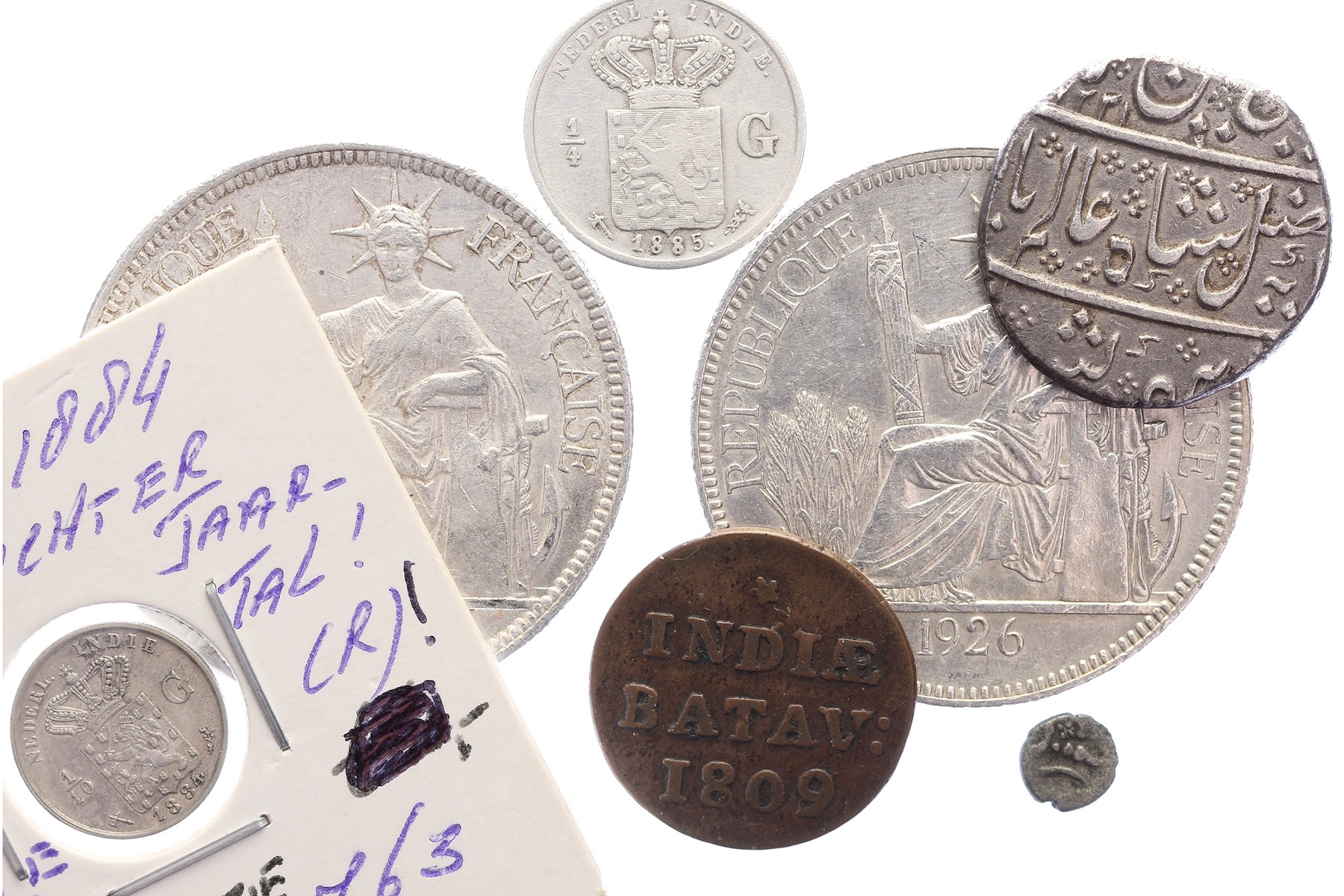 Lot Nederlands-Indië (7) Duit 1809 uit 1808 Scholten 558b, 1/10 Gulden 1884 Scholten 763, ¼ Gulden 1885 Scholten 755, VOC Ceylon zilveren Fanam Scholten 1250. Toegevoegd: Frans Indo-China zilveren Roepia ca. 1807 en 2 x Piastre 1921H en 1926A. Ook zeldzamere! Zeer fraai en beter.