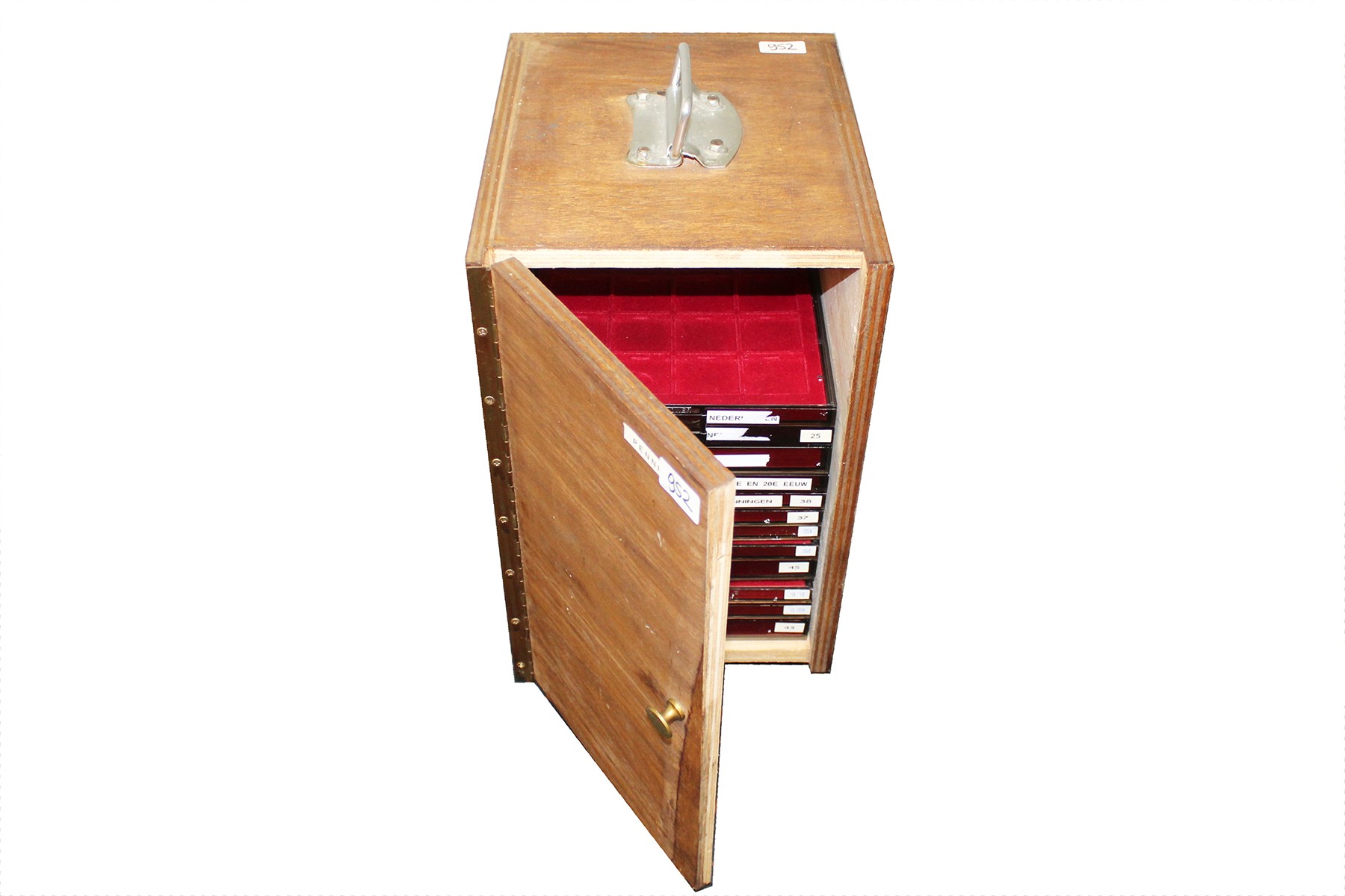In huisvlijt vervaardigde houten transportkoffer/ -kast op wieltjes. Met 12 gebruikte Lindner-tableaus.