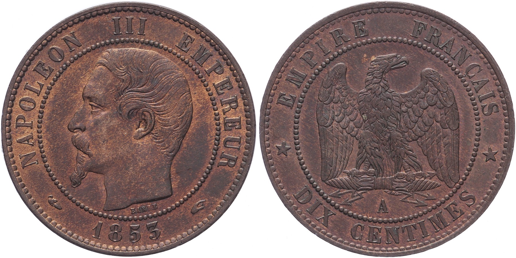 10 Centimes 1853A. Some original color. KM 771.1. XF.