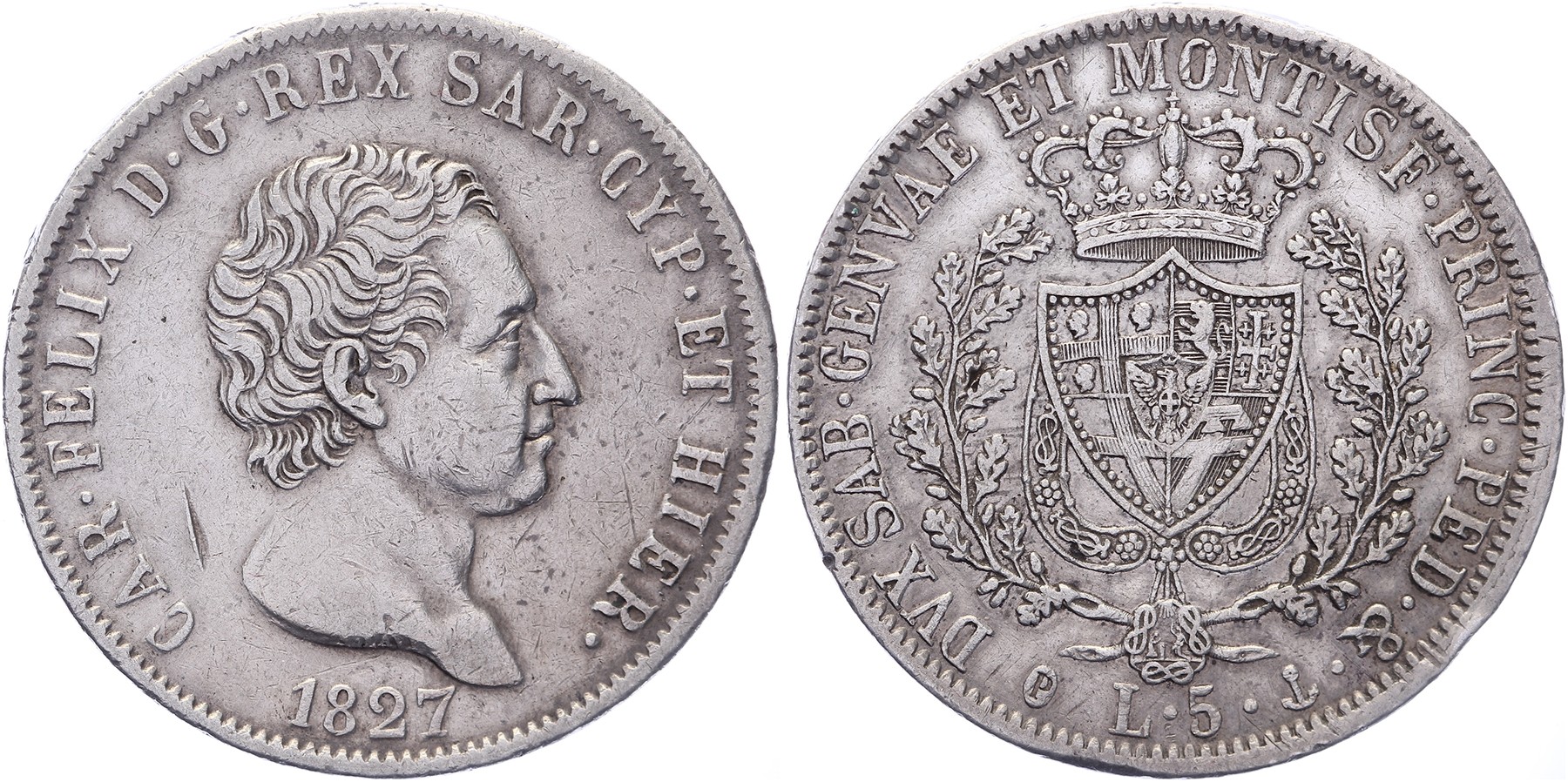 5 Lire 1827P (Genova). KM 116.2; MIR 1035j. Scratch obverse. VF.