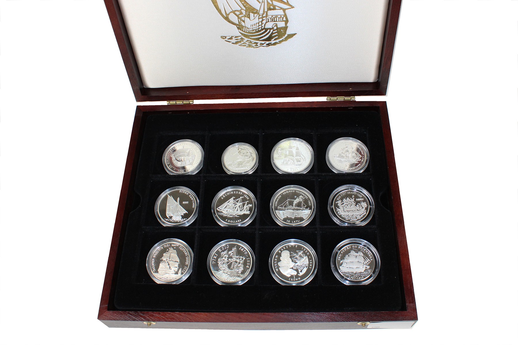 Luxe kist met 24 stuks zilveren munten wereld m.b.t. scheepvaart. Proof.