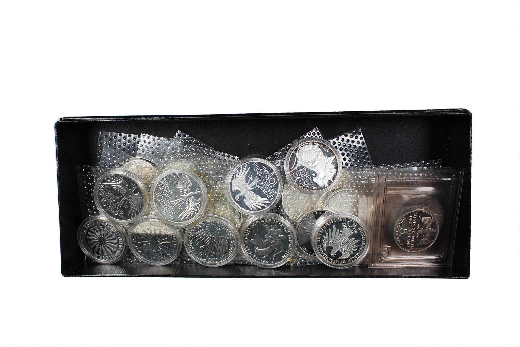 Lot Duitsland met 4 x 5 en 33 x 10 Mark, onder meer Olympiade München en latere herdenkingsuitgiften. UNC en proof.