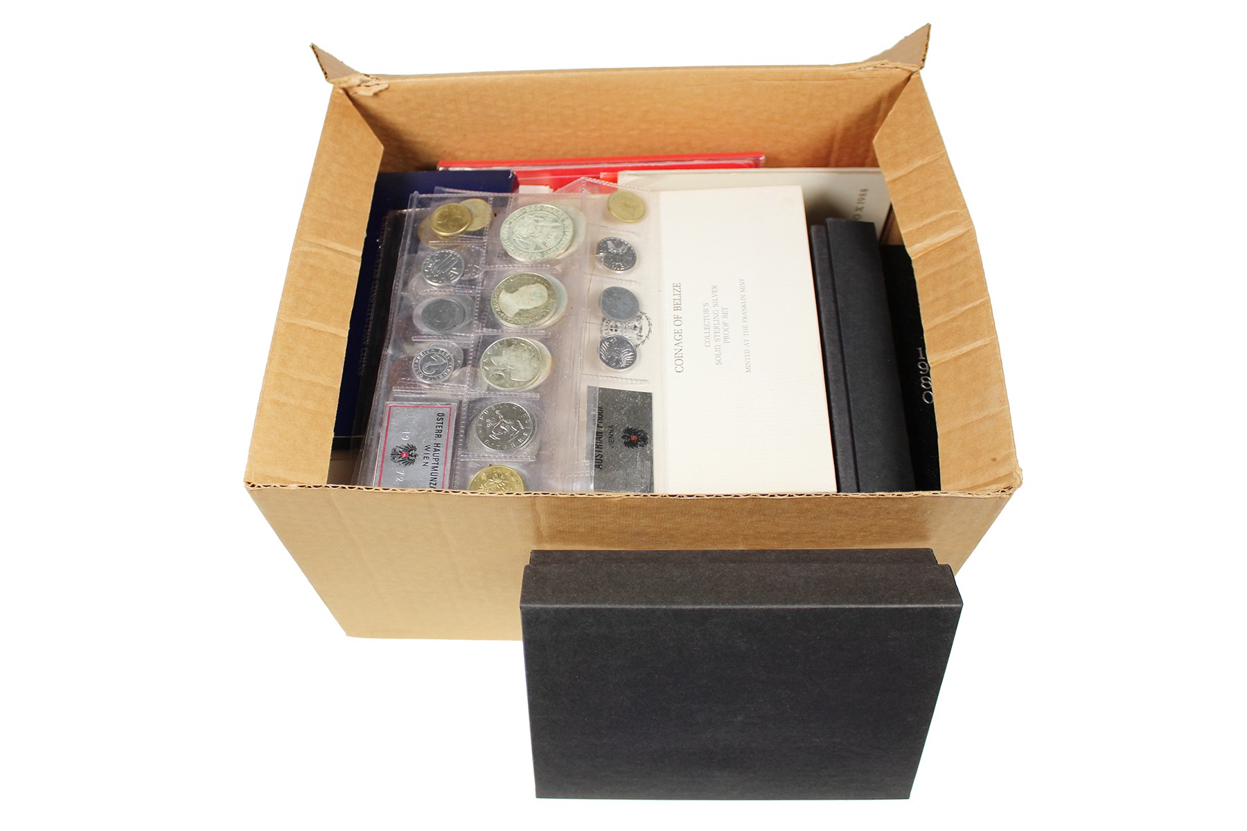 Doos met coinsets from all nations. Ook zilver! O.a. Bahamas, Belize, Canada, Oostenrijk etc. Many silver proof.