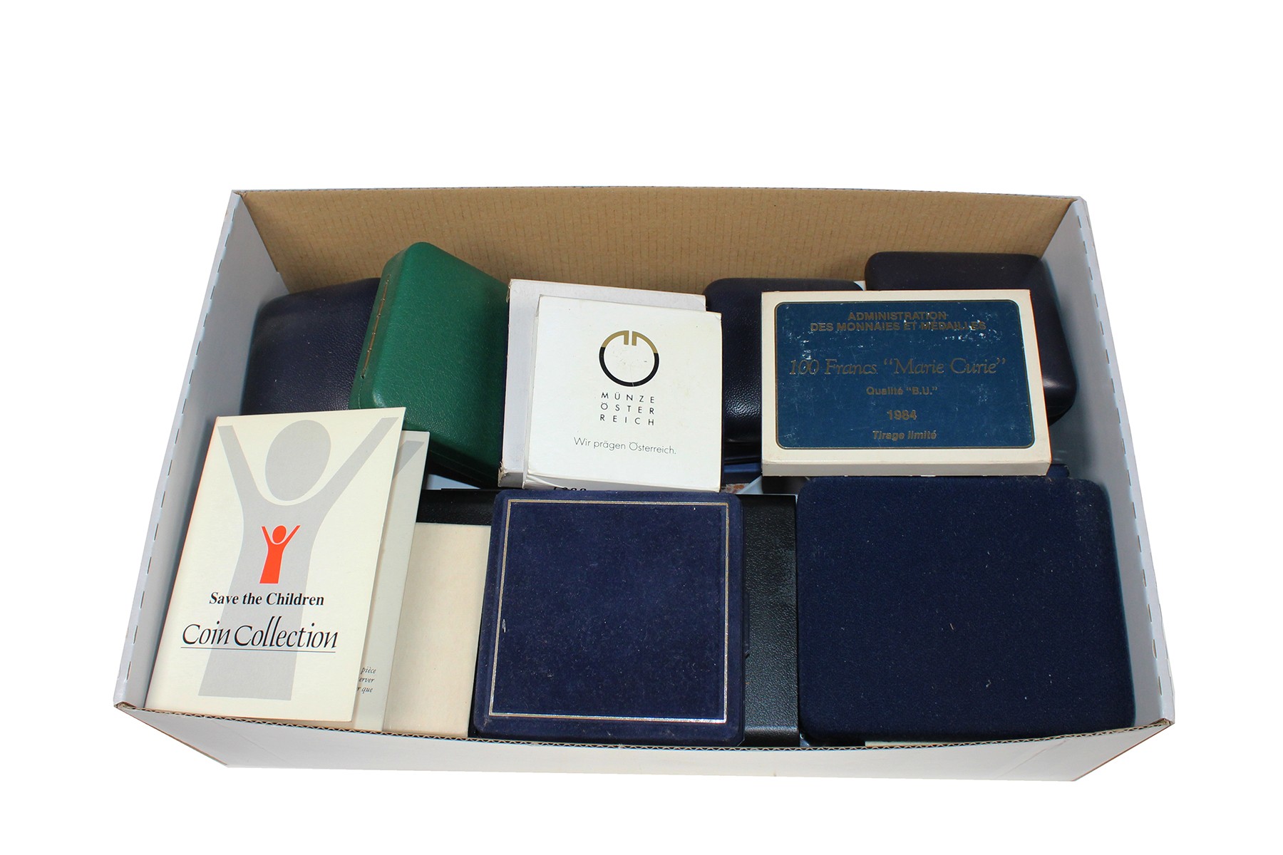Doos met voornamelijk zilveren herdenkingsmunten wereld, ook crown-size. O.a. Austria, Bermuda 5 $ 1988 (5 troy ounce), France, Niue 1988 (5 troy ounce). Ca. 35 stuks.
