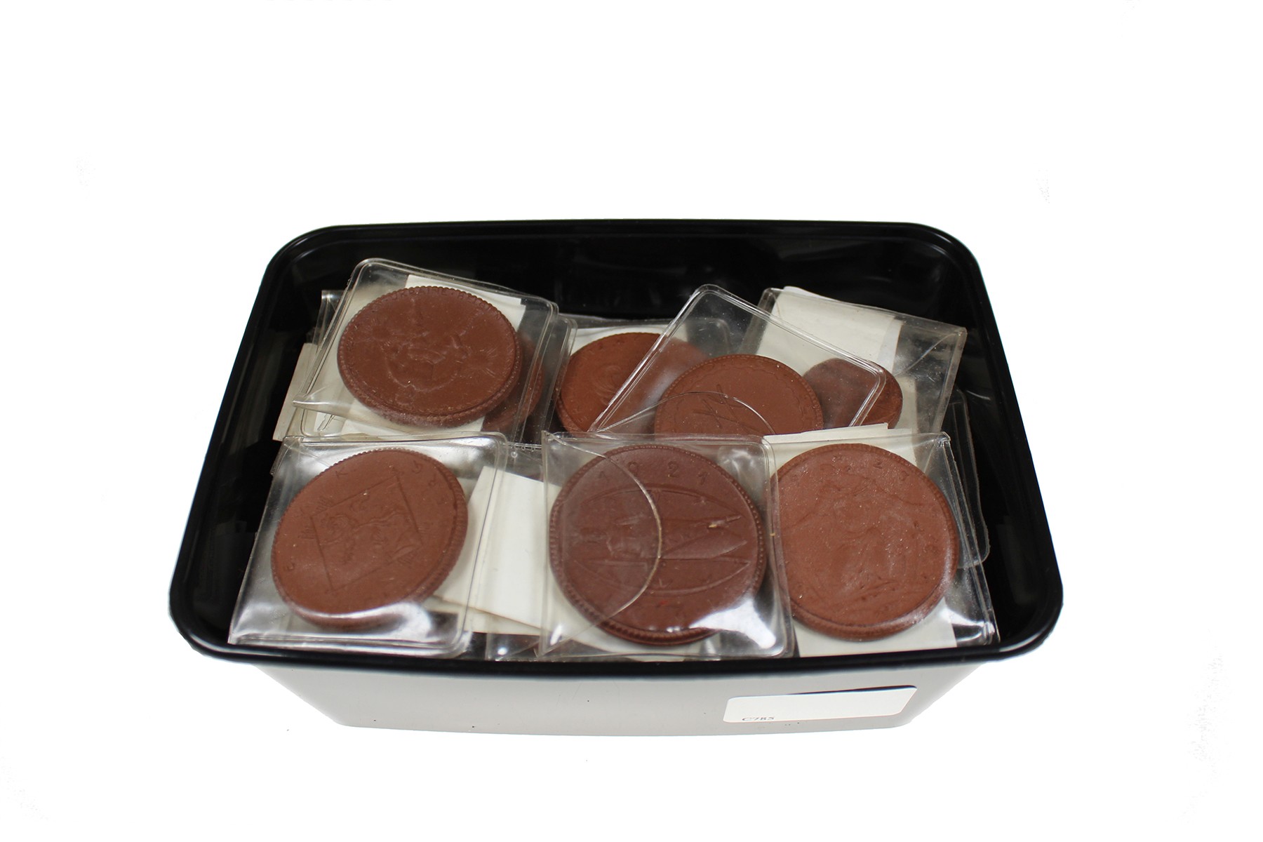 Duitsland – Doos met plastic bakje met ca. 50 stuks onuitgezocht porseleinen geld Duitsland. Diverse steden, goed nazien! Toegevoegd: 2 x set Notgeld.