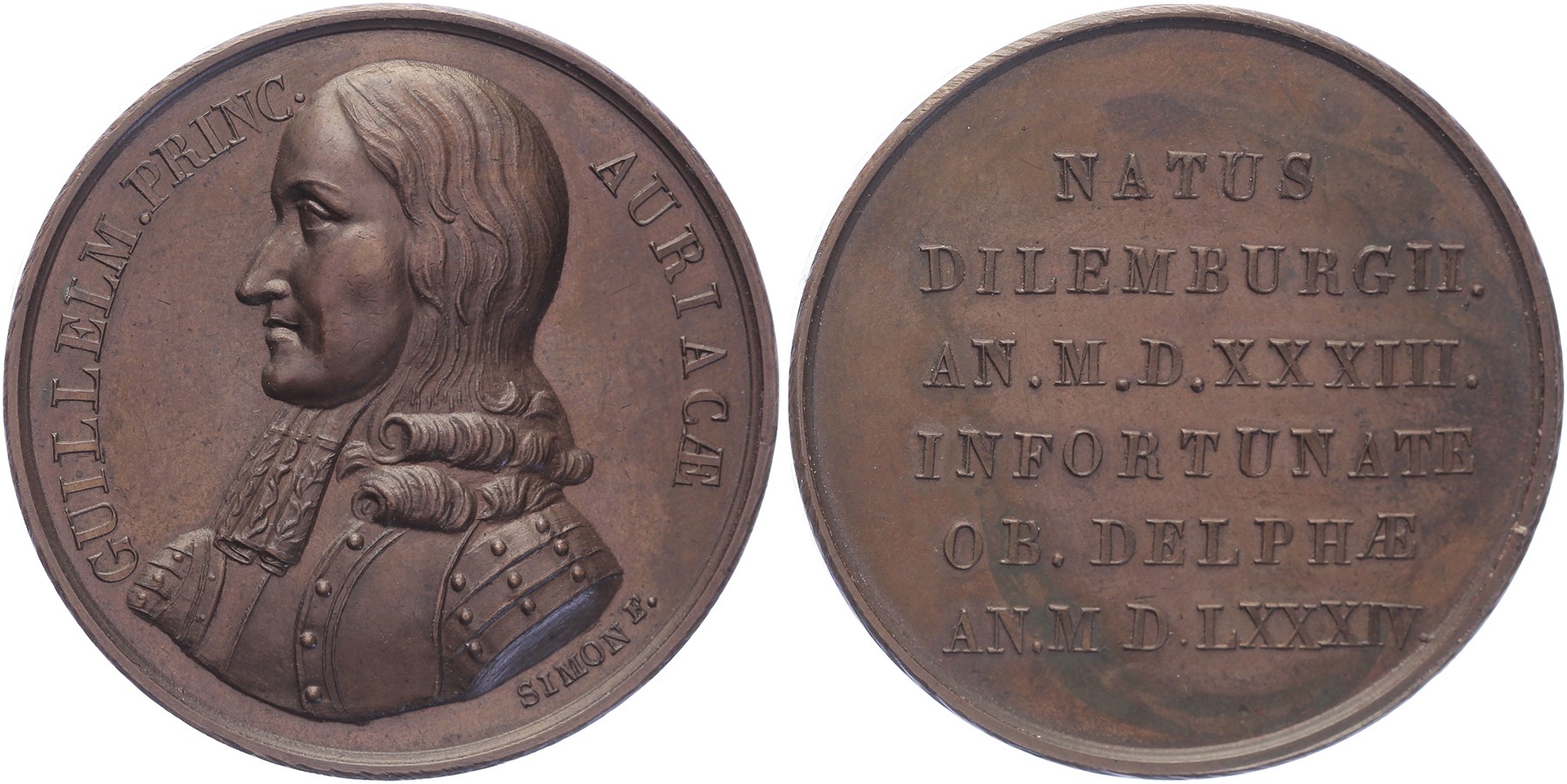 (1816) Willem van Oranje 1533-1584. Borstbeeld Willem van Oranje naar links. / Zesregelig opschrift. Æ 47. J.H. Simon. Galerie Simon. Prachtig.