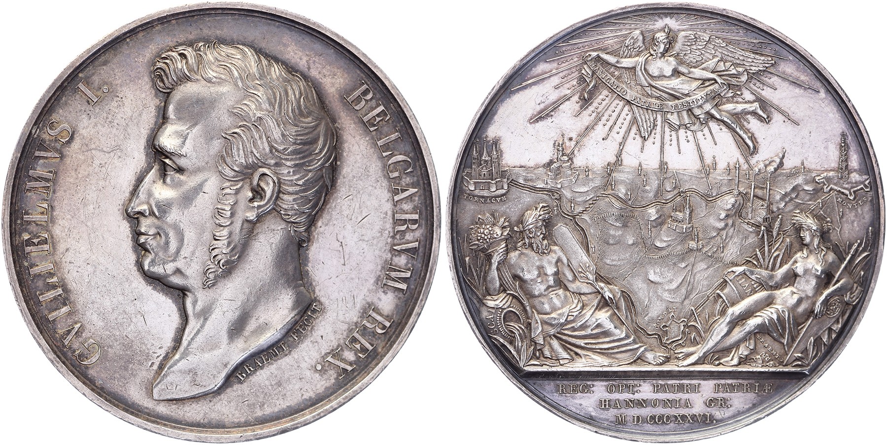 1826 Opening kanaal in Henegouwen. Hoofd koning Willem I naar links. / Onder vliegende Genius landschap met kronkelend kanaal en allegorische figuren. AR 50,2 [48,67 gr.]. Dirks 283. J. Braemt. Prachtig.