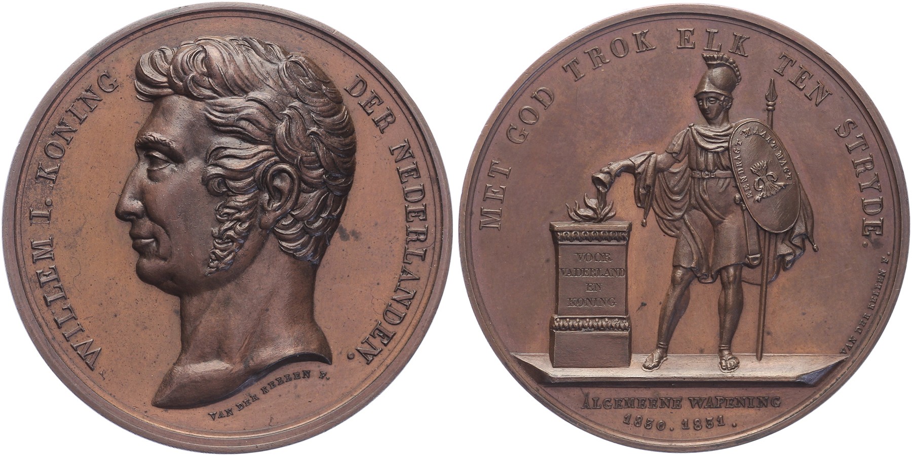 1831 Algemene bewapening in de Noordelijke Nederlanden. Hoofd koning Willem I naar links. / Soldaat in antieke kledij blust een brandend altaar. Æ 52,7. Dirks 441; Bax 183. D. van der Kellen. Prachtig.
