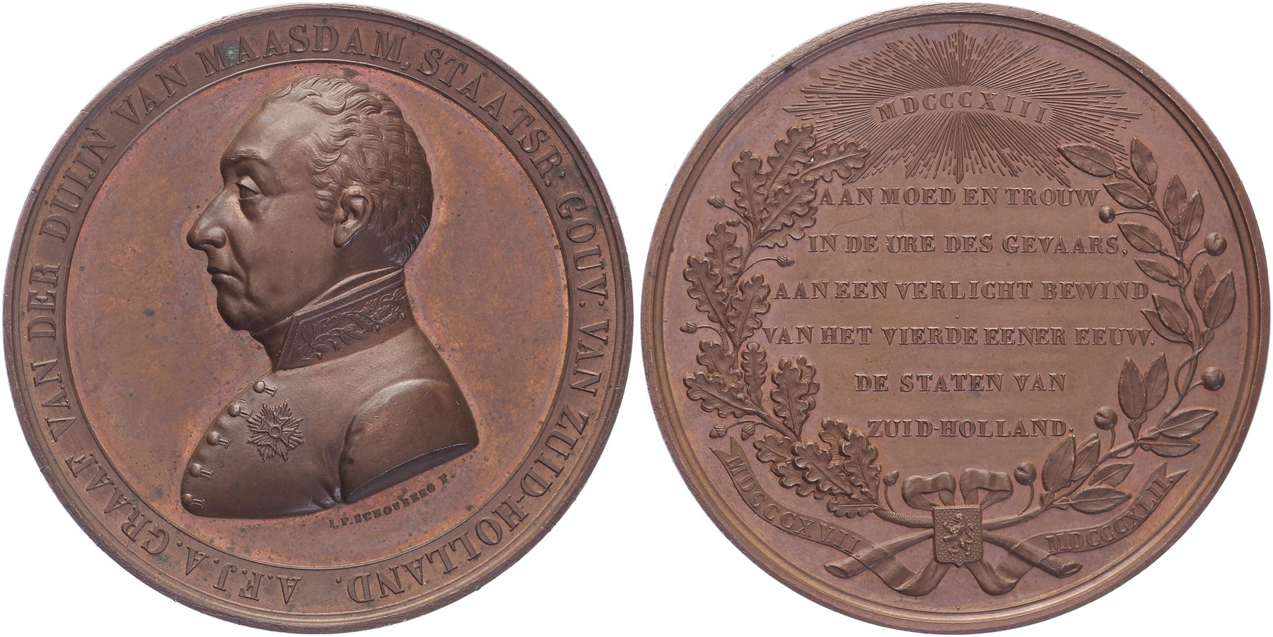 1842 A.F.J.A. Graaf van der Duyn van Maasdam, 25 jaar gouverneur Zuid-Holland. Borstbeeld naar links. / Zesregelig opschrift binnen oranje- en eikentak. Æ 54. Dirks 604. J.P. Schouberg. Prachtig.