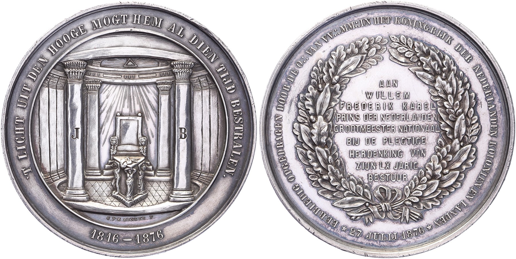 1876 Prins Frederik 60 jaar Grootmeester Nationaal. Interieur maçonnieke tempel. / Op- en omschrift met dikke eiken- en lauwerkrans. AR 61 [80,28 gr.]. Zwierzina 932; Kreeft 56. J.P.M. Menger. Gepoetst, overigens prachtig.N.B. Prins Frederik was de broer van koning Willem II.