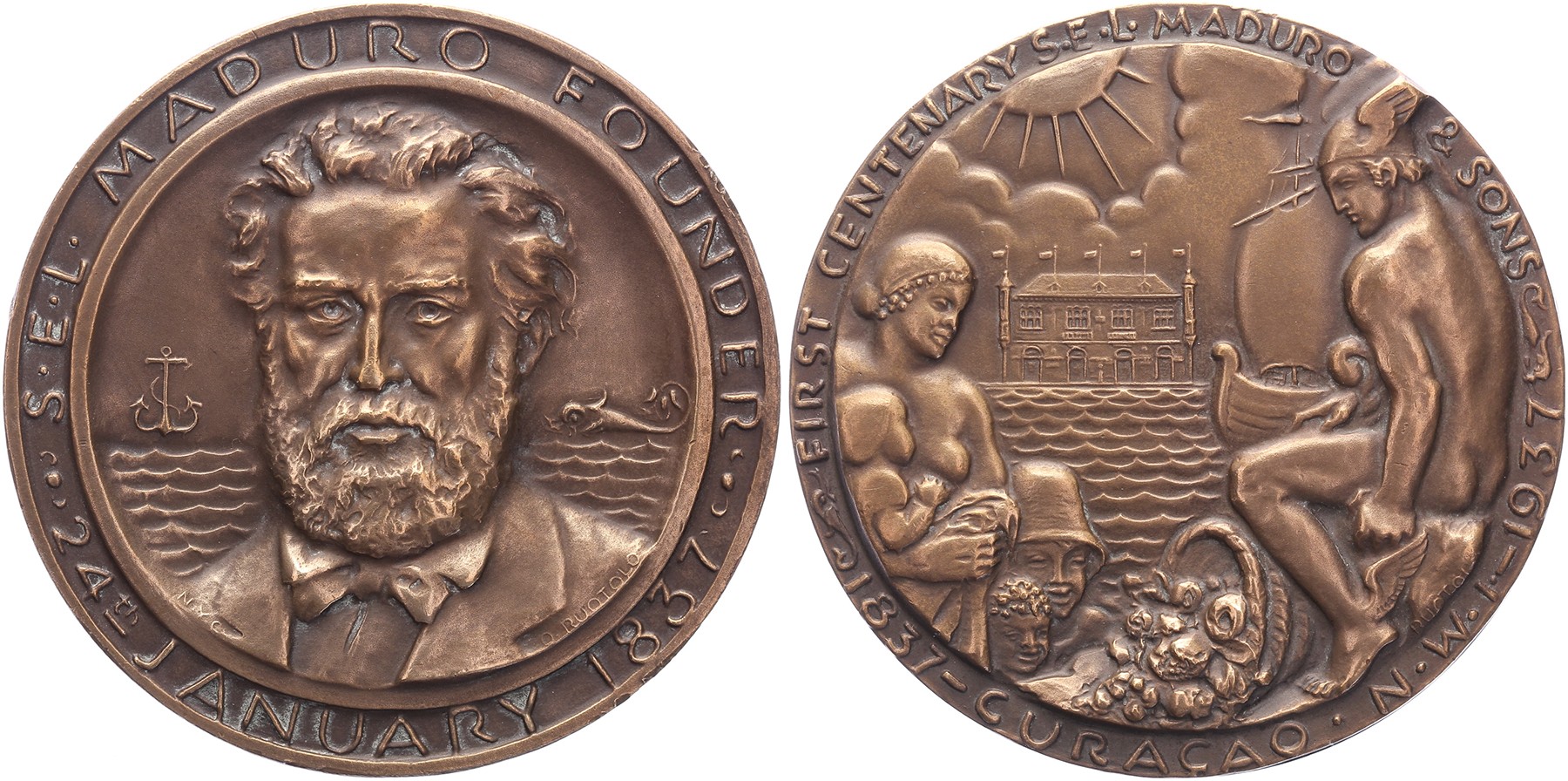1937 Curaçao. Eeuwfeest S.E.L. Maduro & Sons. Borstbeeld stichter Maduro tussen anker en garnaal. / Het Madurogebouw, zittende Mercurius, vrouw met kind en hoorn des overvloeds.Æ gegoten 76. O. Ruotolo. Lichte randschade. Prachtig.