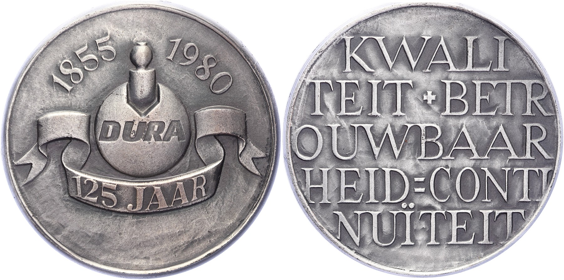 1980 Rotterdam, 125 jaar bouwbedrijf Dura. Logo tussen jubileumdata. / Vijfregelig opschrift.Æ verzilverd 61. (Henk van Bommel). Prachtig.