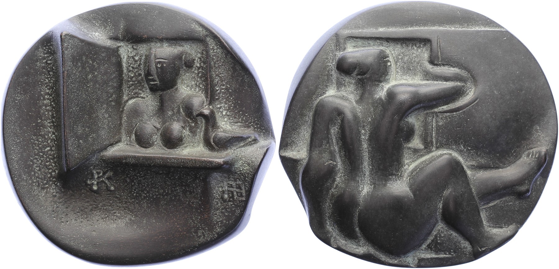 1991 Vrouw in raam. Vrouw kijkt uit raam; duif op de vensterbank. / Vrouw kijkt uit raam op de rug gezien. Æ gegoten 80. Tilanus 495-479. Fons Bemelmans. Prachtig.