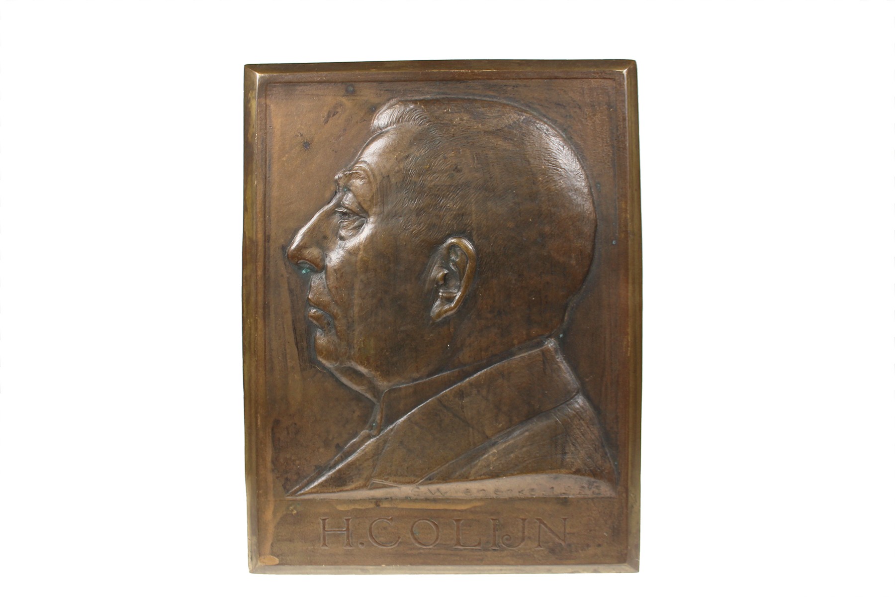1925 Minister-President Hendrik Colijn. Borstbeeld naar links met recht borstafsnede. / (incusum vz. + twee draagogen). Eénzijdige plaquette Æ gegoten 160 x 208 mm. Vgl. CJCW 234. Zeer fraai.