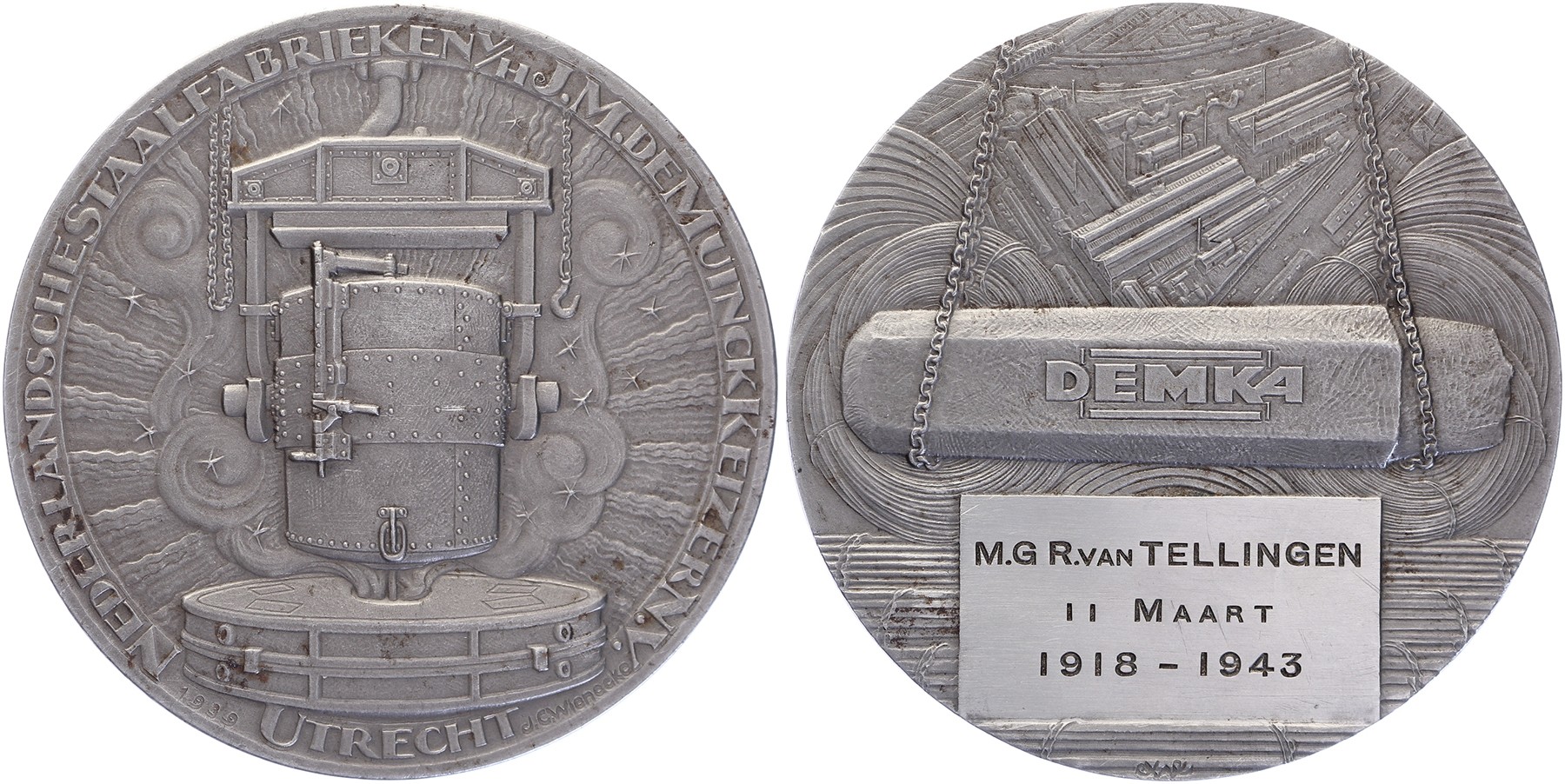 1939. Utrecht. Personeelspenning Nederlandsche Staalfabrieken voorheen J.M. de Muinck Keizer N.V. Gietmachine omgeven door rookwolken giet vloeibaar staal in ronde mal. /Inscriptieruimte onder stalen balk aan ketting waarop DEMKA. Daarboven bedrijfshallen in vogelvlucht gezien. O.n.v. M.G.R. van Tellingen 1918-1943. Staal 70 mm. Vgl. CJCW 431. Prachtig.