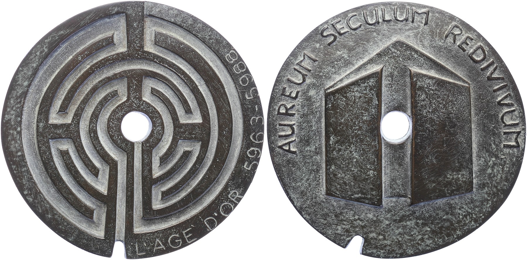 L’Age d’Or 25 jaar. Labyrint met L’Age d’Or. / Tempeldeuren met tekst Aureum Seculum Redivium.Æ 95 met gat. Prachtig.