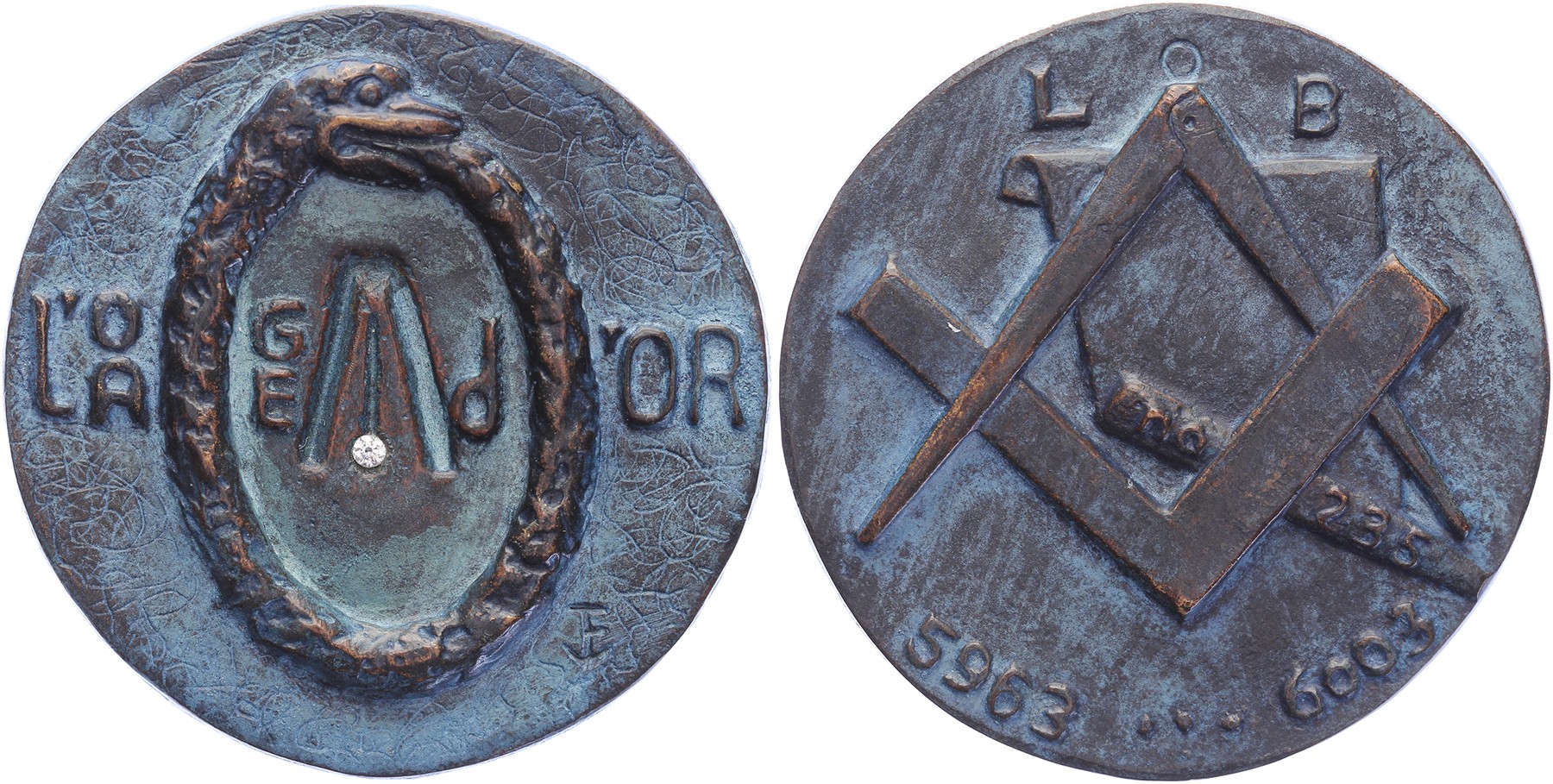 L’Age d’Or40 jaar. Logo met zirkonia. / P en W met boekrol, tekst en jaartallen. Æ 60. Prachtig.