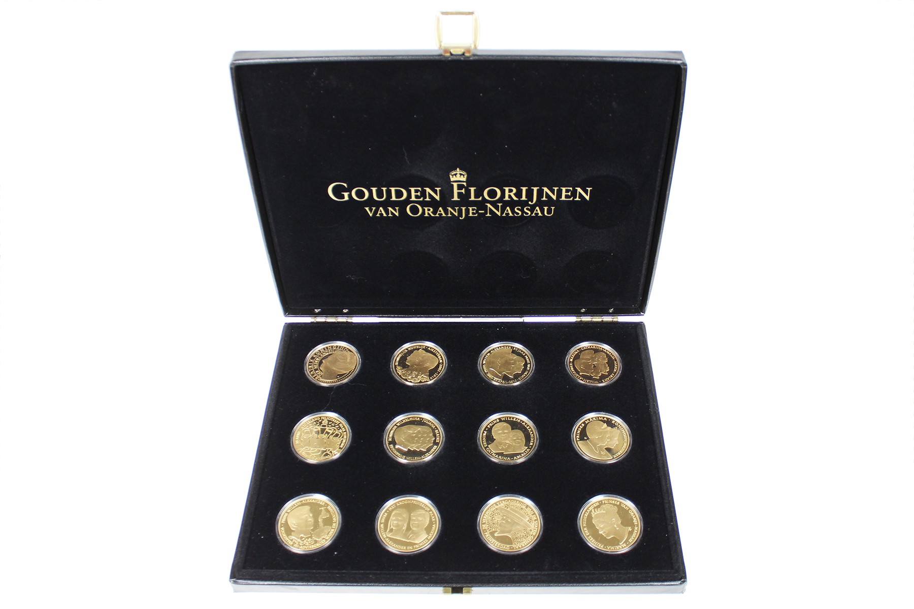 Lot (16) Gouden Florijnen van Oranje-Nassau in 2 luxe cassettes. Alweer zo’n mooie onvolprezen uitgifte van Het Nederlands Muntenhuis. Compleet met beschrijving! Proof.