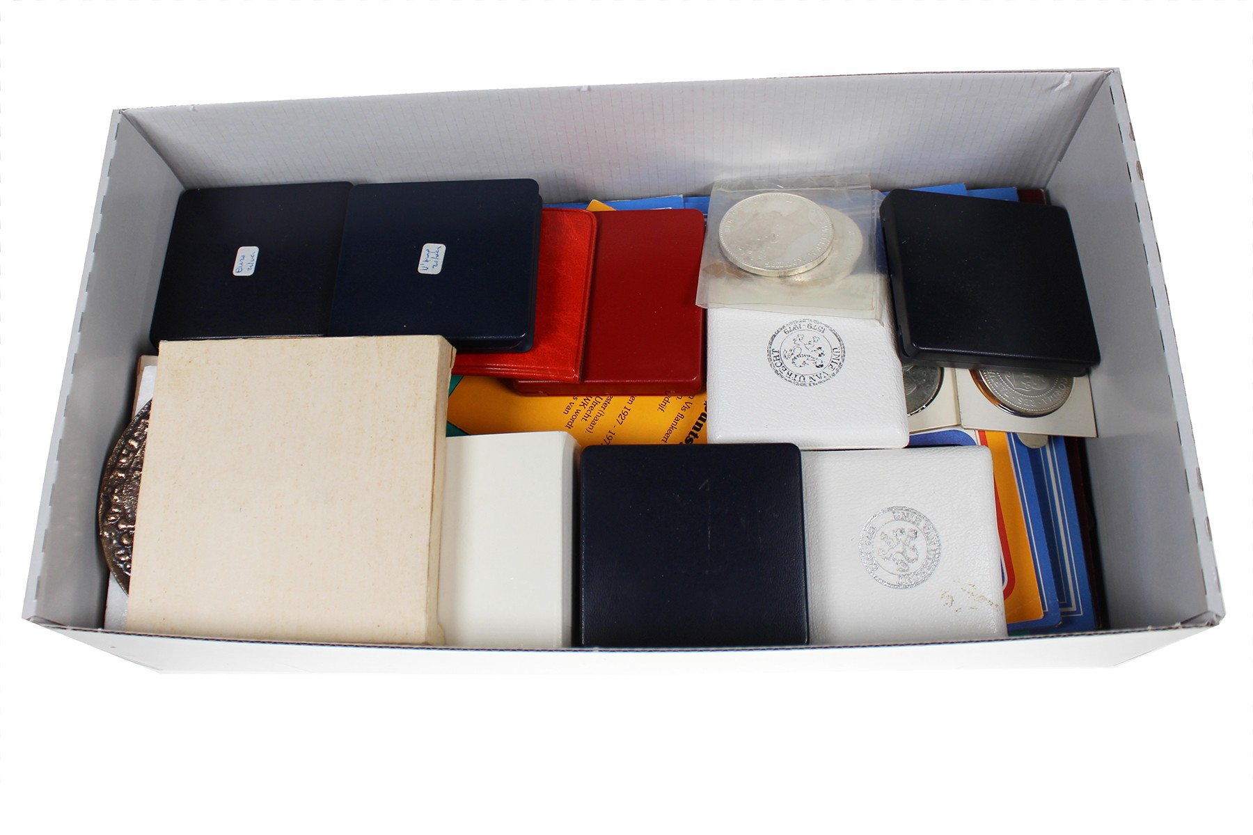 Doos met diverse moderne penningen, o.a. Unie van Utrecht, 20 gulden 1977 GWK. Iets bling bling. Ook zilver.