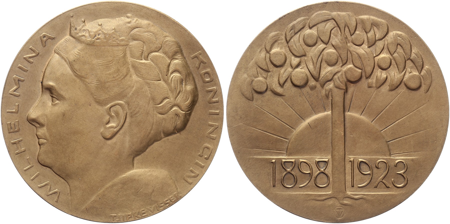 1923 25-jarig regeringsjubileum Koningin Wilhelmina. Portret naar links. / Oranjeboom met opkomende zon boven jubileumdata. AR verguld 60. JMP 1954, pag. 43, nr. 73. Tjipke Visser. Overwegend Prachtig.