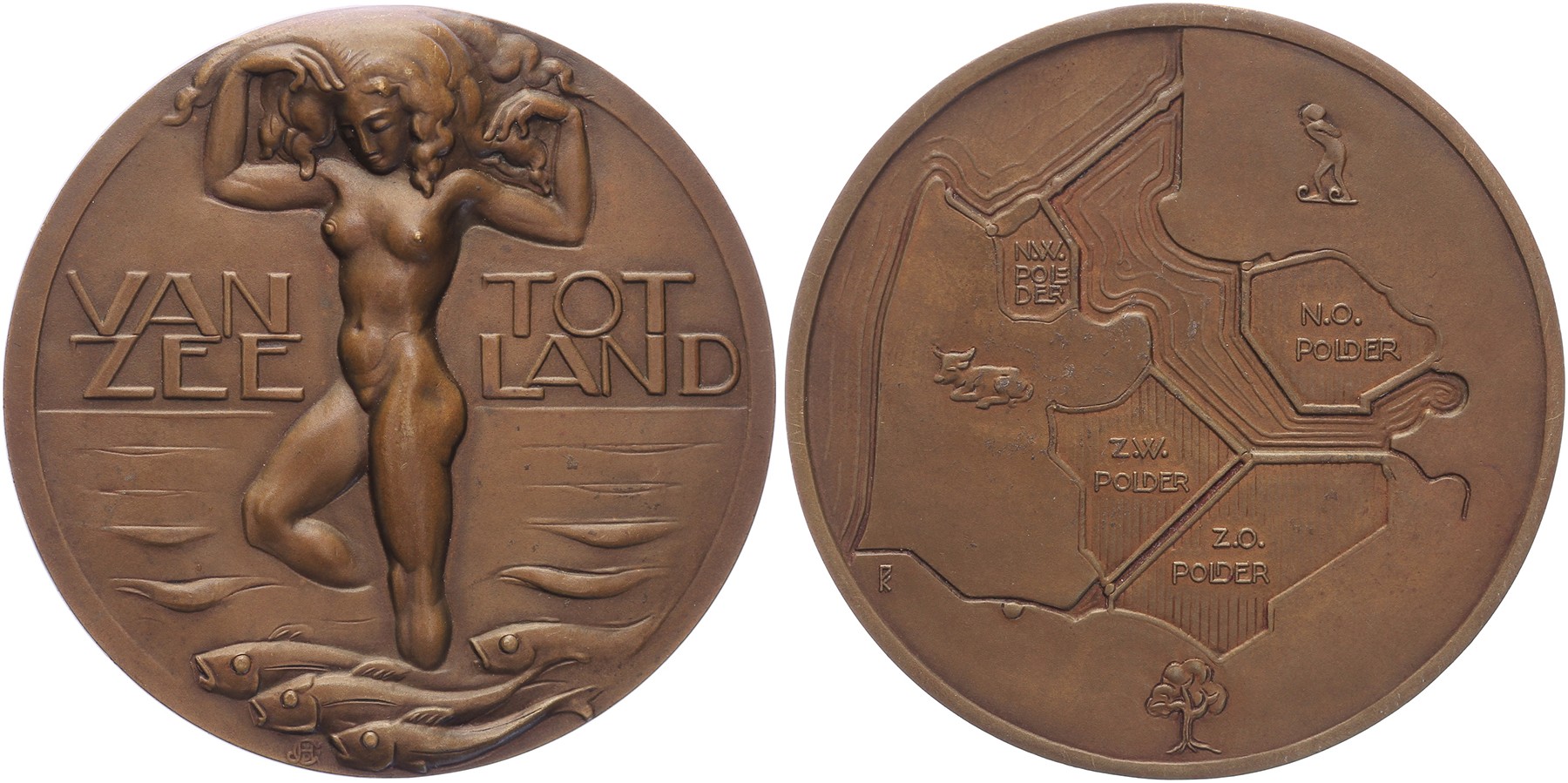 1930 Plan Droogmaking Zuiderzee. Naakte vrouw stapt uit zee met vissen. / Landkaart van de toekomstige polders. Æ 60. KB III-451; Tilanus pag. 79-81. G.J. van den Hof. Overwegend prachtig.