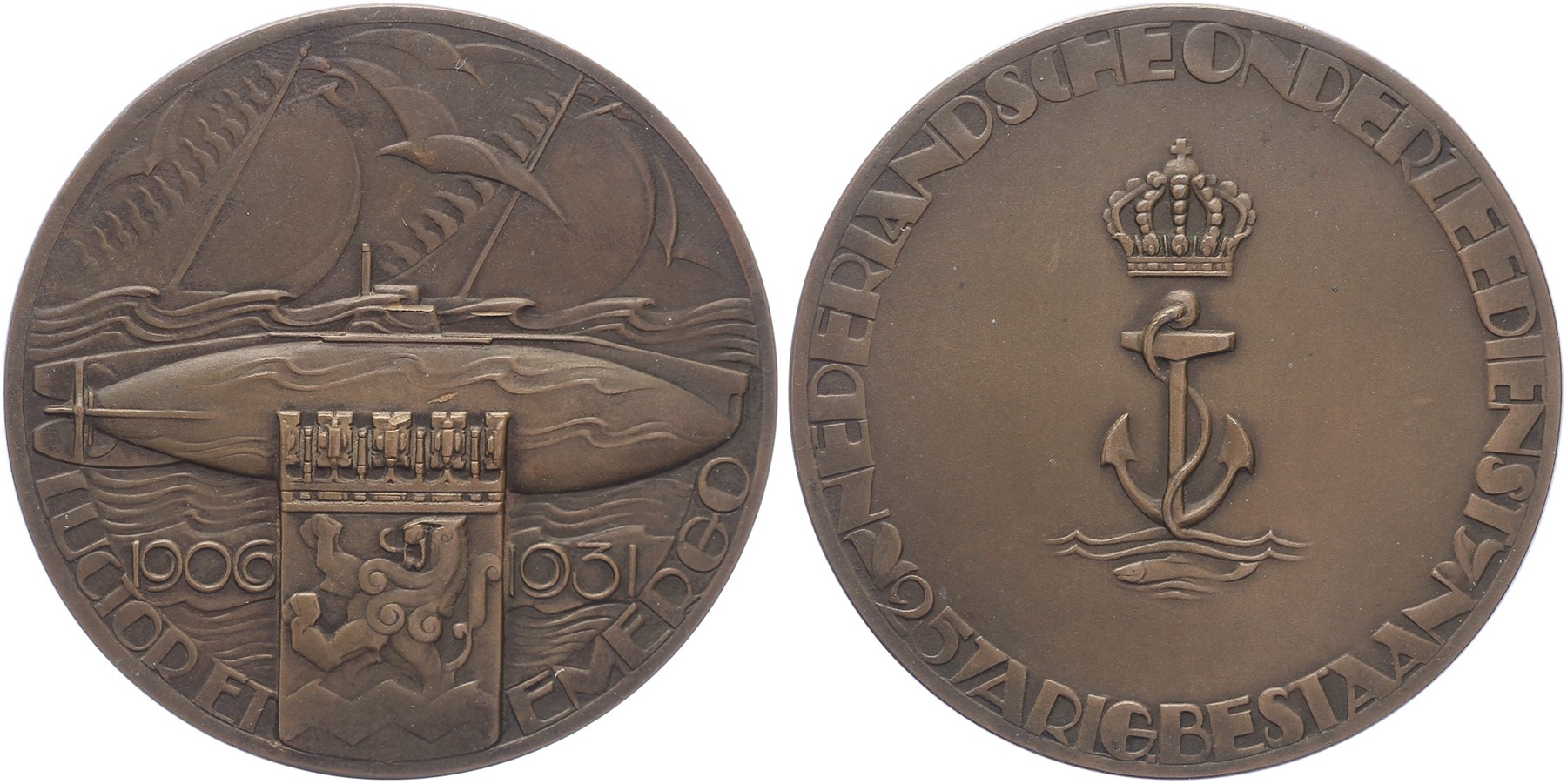 1931 25 Jaar Nederlandse Onderzeedienst. Duikboot onder water met gekroond Zeeuws wapen tussen jaartallen. / Gekroond onklaar anker boven bruinvis. - Æ 50. KB III-581; Jintes/Pol 251. C.J. van der Hoef. Overwegend prachtig.