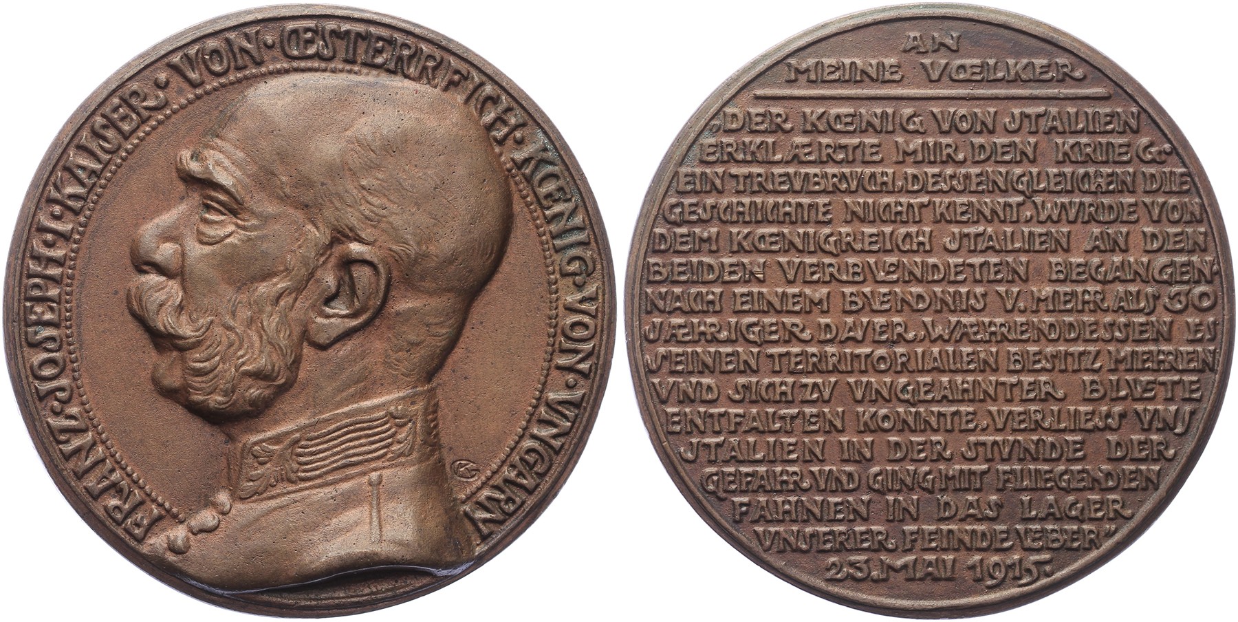 1915 Kriegserklärung von Italien an Österreich-Ungarn. Brustbild Franz Josephs nach links. / 18 Zeilen Schrift. Æ gegossen 71. Kienast 159. Selten. Vorzüglich.